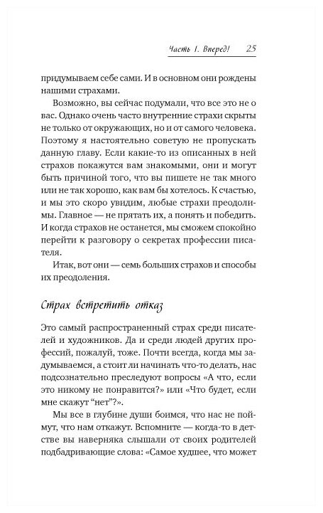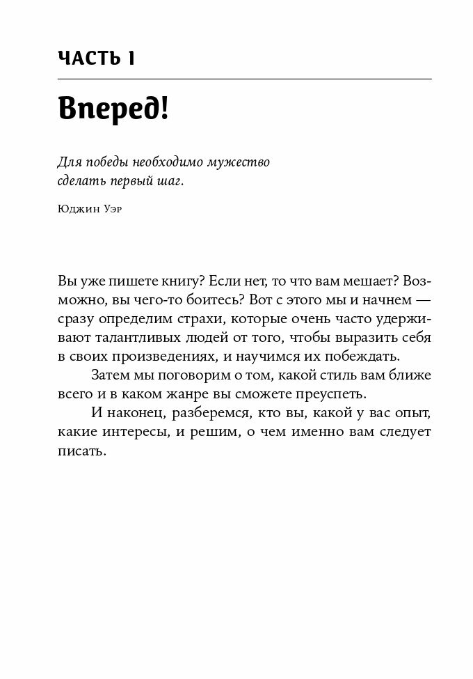 Книга отличная. Информация подана сжато и по делу. Понравилось упражнение, в котором нужно было за 5 минут придумать историю. Хорошо разминает мозг перед сочинением своей истории. Так же в книге приводятся полезные техники по раскрытию персонажа. Полезным оказались советы "не отвергать первые идеи" и "записывать все, что приходит в голову". Иногда полезно заставить внутреннего критика замолчать, чтобы дать себе возможность свободно творить.