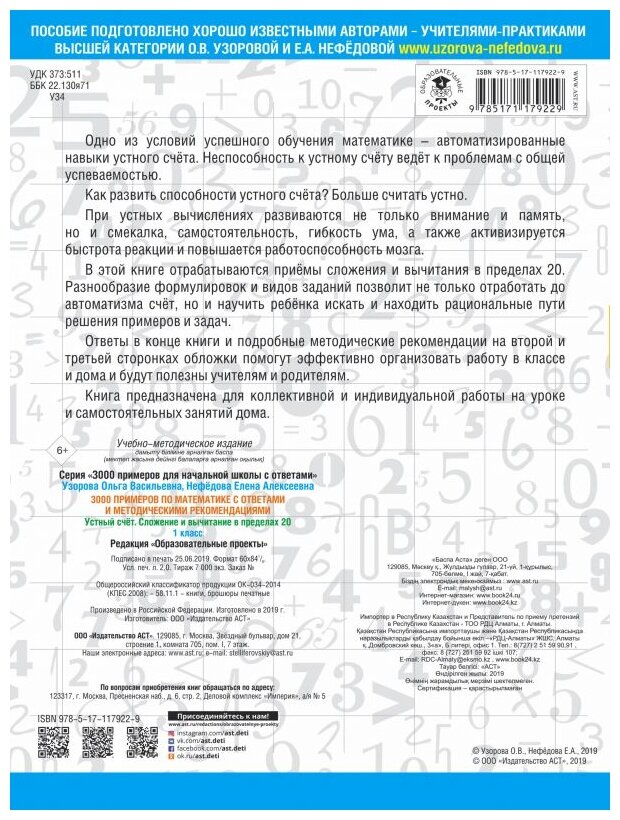 3000 примеров по математике с ответами и методическими рекомендациями. Устный счет. Сложение и вычит (Узорова Ольга Васильевна, Нефедова Елена Алексеевна); ООО "Издательство Астрель", 2019