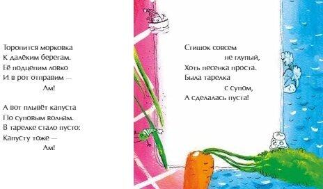 Это книжка-малышка с песенкой про суп поможет незаметно опустошить тарелку, что немаловажно для всех мам и бабушек мира. Другие забавные стихи помогут родителям пережить такие важные события, как путешествие на дачу, ожидание в пробке и уборка комнаты. Безусловно полезные стихи!