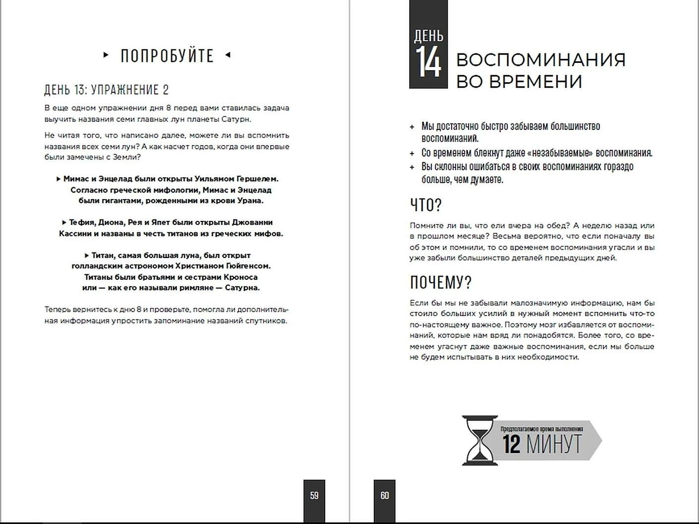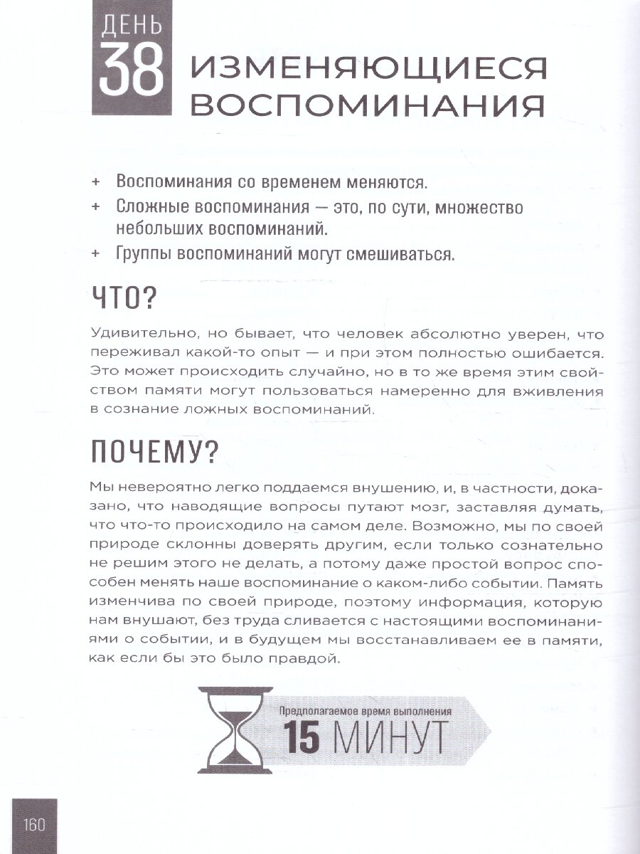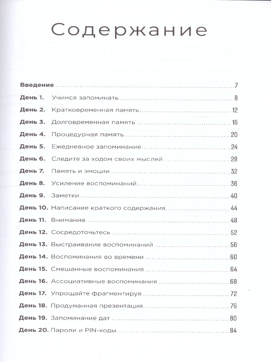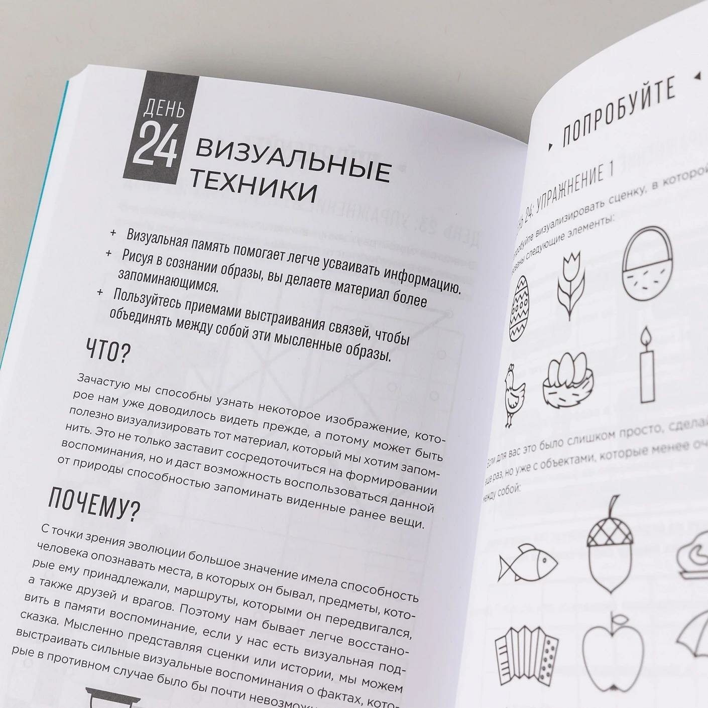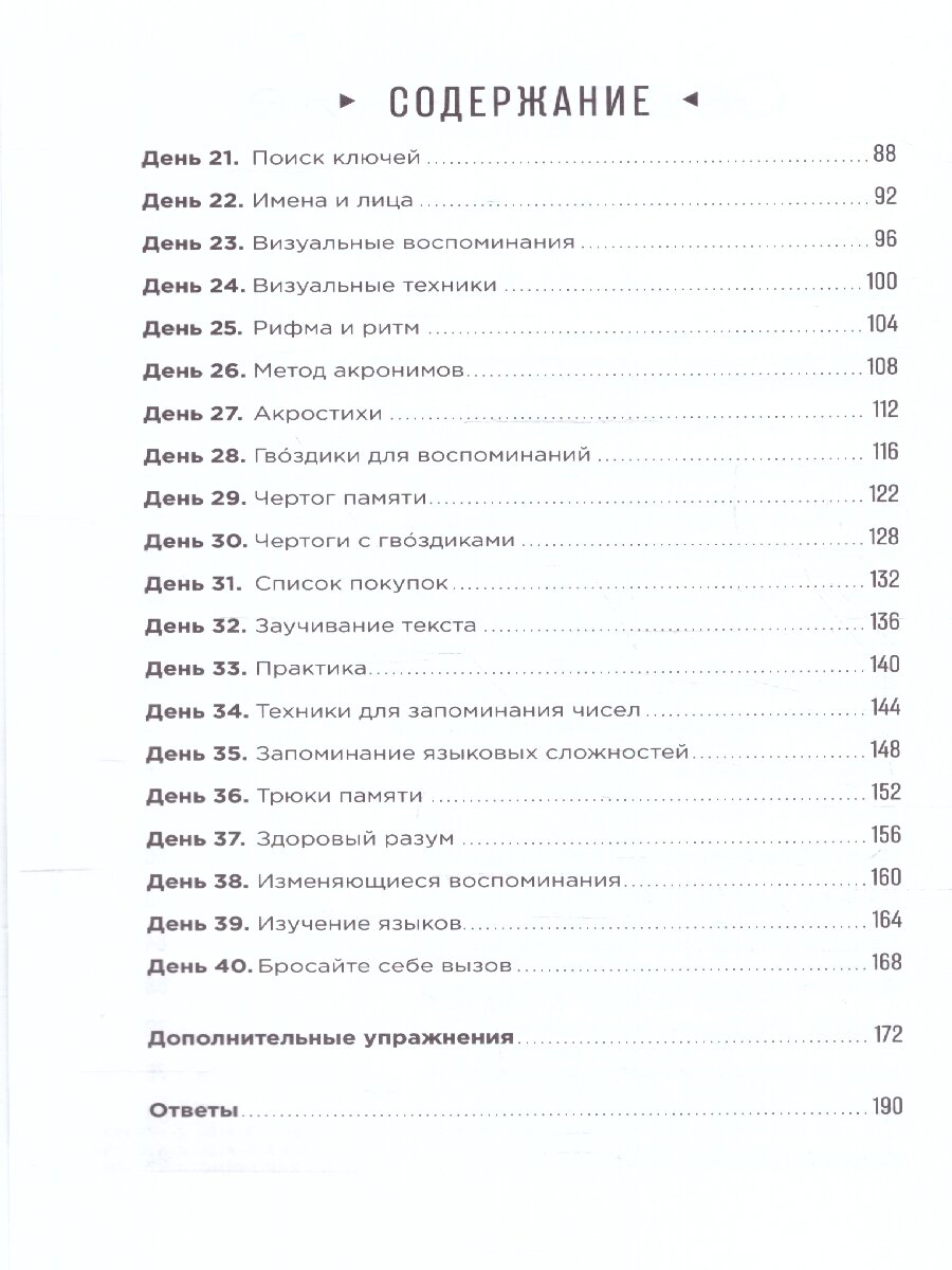 Уникальный и практичный курс развития памяти за 40 дней. Автор книги описывает ежедневные шаги развития памяти достаточно доступно и при этом предлагает на каждый день упражения от простых вариантов в начале курса и более сложных в конце курса. В целом книга очень удобна в использовании, изучении, пишем ответы прямо в книге по необходимости при выполении упражнений. Ценная книга!