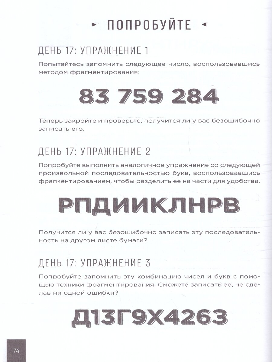 Отличная книга для мозгов, будет полезна как для молодых, так и для пожилых, главное не забывать заниматься. Упражнения рассчитаны на 40 дней, и каждый день разные упражнения. Например посмотреть на цифры и записать их в том же порядке, попробовать написать страны на материке, запомнить слова, маршрут, смайлы, предметы, ассоциации. Шрифт средний, бумага немного просвечивает.