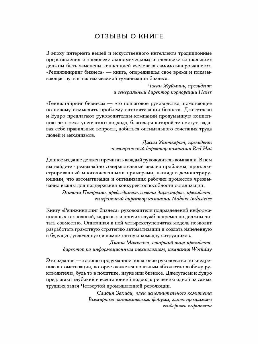 Сегодня лидеры компаний по всему миру задаются вопросом, каким образом внедрение автоматизации и искусственного интеллекта может повлиять на бизнес. В какой мере это затронет их собственную работу, деятельность команды, начальства, коллег, друзей и родных? Заменят ли роботы людей? Какие именно отрасли будут автоматизированы в первую очередь? Равин Джесутасан и Джон Будро, признанные авторитеты в вопросах человеческого капитала и автоматизации, не ограничиваются попытками определить, в чем именно роботы заменят людей. Авторы предлагают системный подход в формате пошаговой четырехступенчатой модели, с помощью которой менеджеры сумеют найти оптимальное соотношение искусственного интеллекта и работы специалистов. В книге представлен уникальный опыт мировых компаний в сфере автоматизации, что делает ее особенно интересной. Книга удостоена золотой медали престижной книжной премии Axiom Business Book Awards 2019.