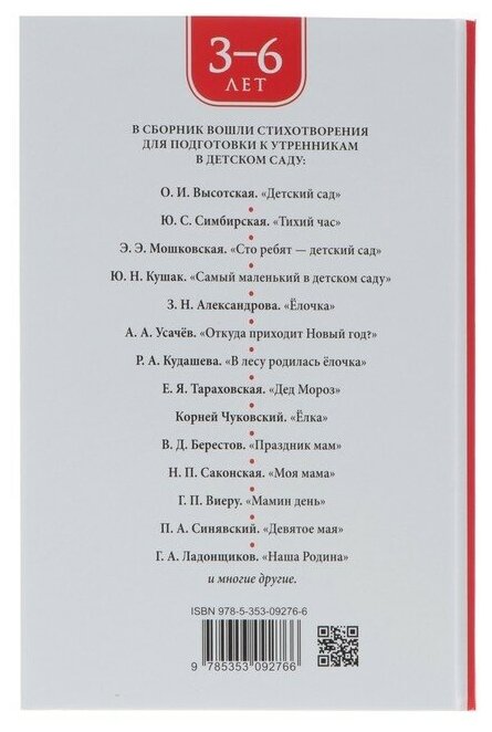 В книгу вошли стихотворения лучших детских поэтов про детский сад, про выбор профессии, времена года. Стихи Пушкина А. С., Бунина И. А., Фета А. А., Тютчева Ф. И, Высотской И. О., Брестова В. Д., Осеевой В. А., Симбирской Ю. С., Токмаковой И. П., Усачева А. А., Синявского П. А. и многих-многих других.