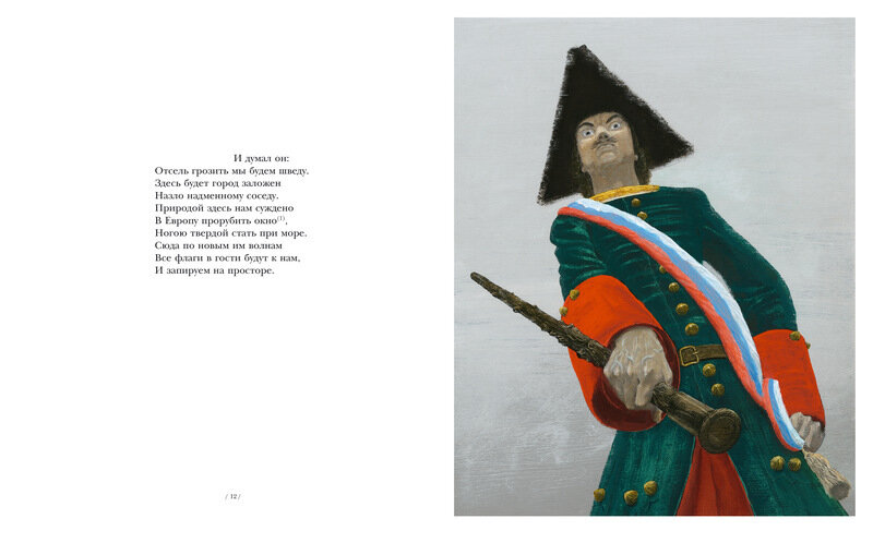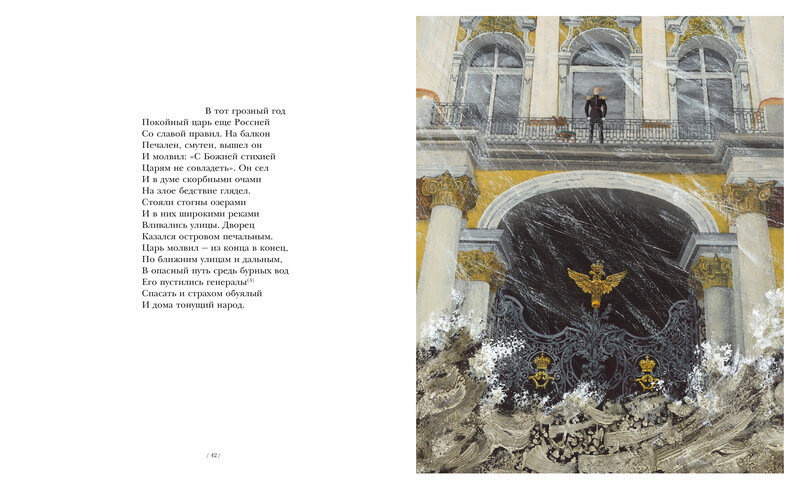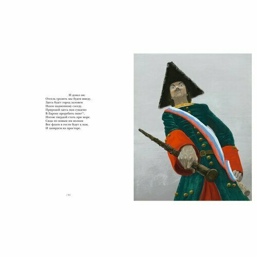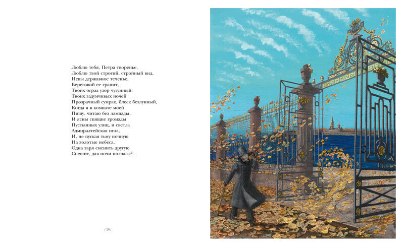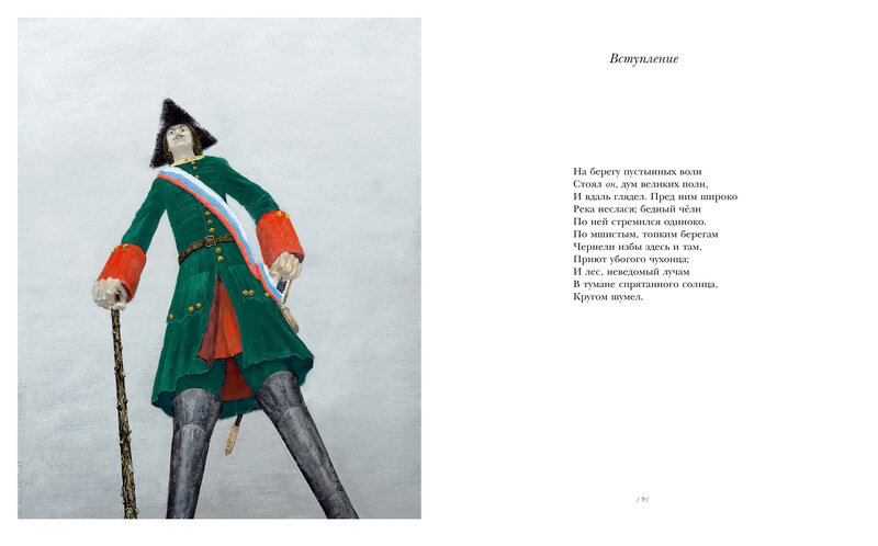 Эта книга — авторский проект замечательного художника Михаила Бычкова, в иллюстрациях которого эпизоды пушкинской поэмы и пушкинский Петербург буквально оживают. «Я не ставил перед собой задачу проиллюстрировать „Медный всадник“. Мне хотелось создать живописный эквивалент поэмы — сложный, многоуровневый, как и она сама». Поэма «Медный всадник», одно из самых глубоких и совершенных произведений А. С. Пушкина, написана в Болдине в октябре 1833 года. В ней изображено масштабное наводнение в Петербурге 7 ноября 1824 года. Назвав свое произведение «петербургской повестью», Пушкин открыл в русской литературе тему большого города. Трагическое событие, сломавшее привычный ход жизни, оборачивается настоящей фантасмагорией, закономерностью, связанной с особенной судьбой Петербурга в русской истории и культуре. При жизни поэта было опубликовано лишь начало «Медного всадника»: «высочайший цензор» Николай I потребовал внести в поэму изменения, на которые Пушкин не согласился пойти.В издание также включена статья Михаила Бычкова, а также статья и комментарии литературоведа Галины Потаповой.