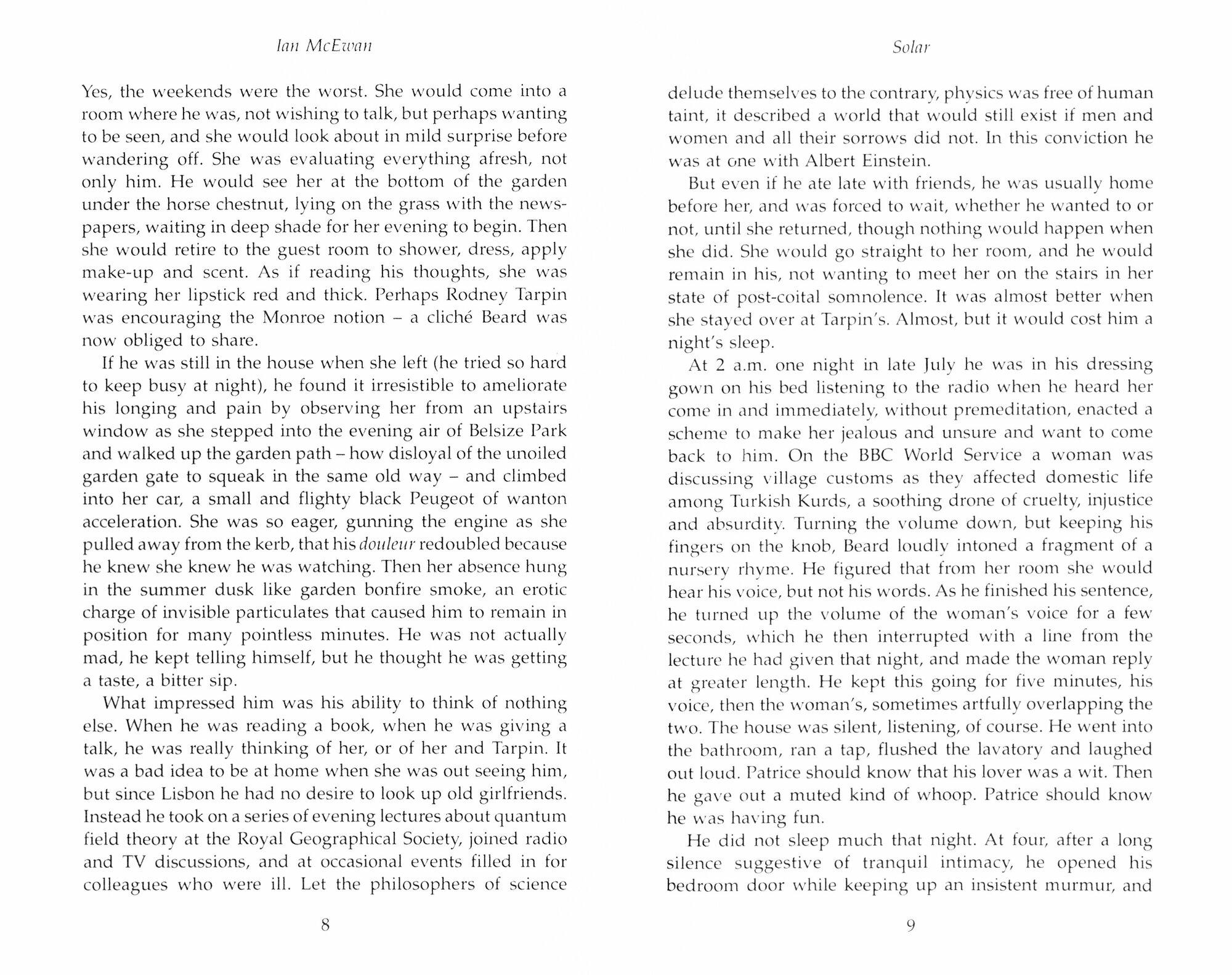 Michael Beard is a Nobel prize-winning physicist whose best work is behind him. A compulsive womaniser, Beard finds his fifth marriage floundering. But this time it is different: his wife is having the affair, and he is still in love with her. When Beard's professional and personal worlds collide in a freak accident, an opportunity presents itself for Beard to extricate himself from his marital mess, reinvigorate his career and save the world from environmental disaster.