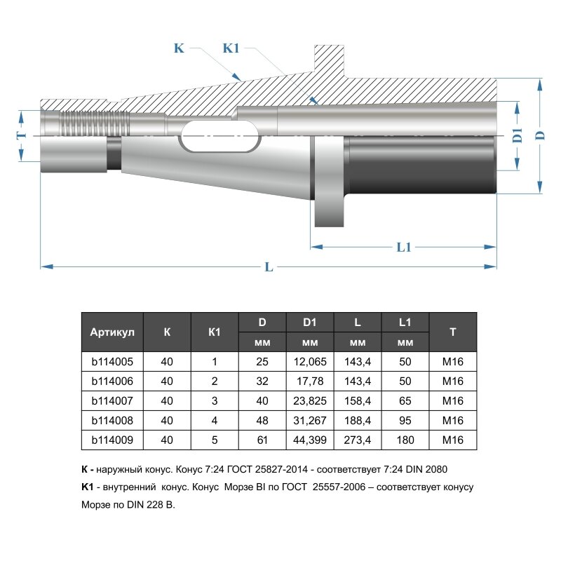 • Используются для установки инструмента с коническим хвостовиком в станочный шпиндель, если конус инструмента не совпадает с конусом шпинделя. • Основное применение – для крепления сверл с коническим хвостовиком.• Предназначены для работы на станках без ЧПУ.• Материал – сталь 40Х по ГОСТ 4543-71.• Наружный конус – конус 7:24 ГОСТ 25827-2014 - соответствует 7:24 DIN 2080 (для ручной смены инструмента).• Внутренний конус – конус Морзе BI по ГОСТ 25557-2006 – соответствует конусу Морзе по DIN 228 форма B.