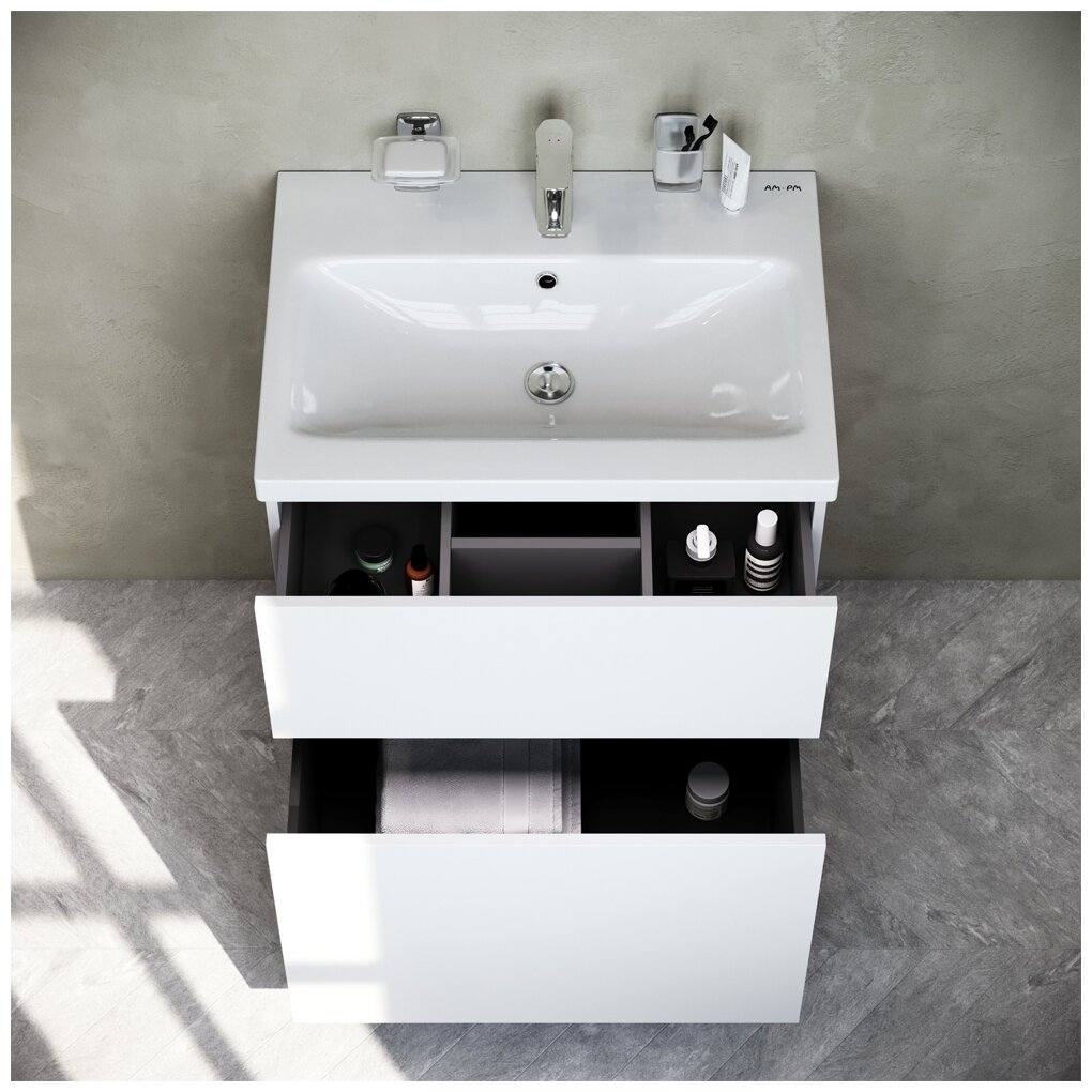 Тумба под раковину AM PM Gem 60 белая, с глянцевой поверхностью, с двумя выдвижными ящиками, с двумя хромированными ножками, для длительного срока службы в ванных комнатах с повышенной влажностью.