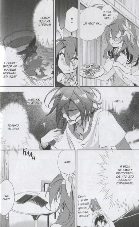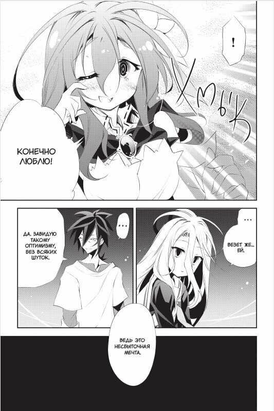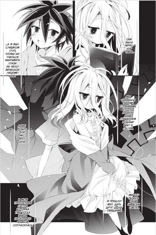 Мангу Без игры нет жизни я решил купить только потому, что первоисточник и аниме мне очень понравились. Конечно манга в целом не уступает ни аниме, ни ранобэ, но слишком медленный выход и совсем короткие истории, которые умещаются на страницах манги немного огорчают. Но перейдем к плюсам, а именно это сама рисовка, интересный сюжет для подобных мне (игроманам), которые мечтают разрешать споры по средствам игр. Достаточно много смешных моментов.