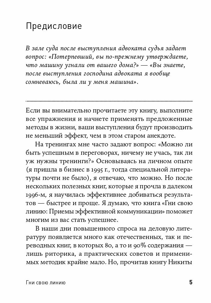 Проводя переговоры и презентации, проходя собеседование с будущим работодателем, участвуя в дискуссиях на самые разные темы на работе и за ее пределами, мы выстраиваем процесс коммуникации с людьми. Будьте честны с собой: далеко не всегда нам удается достичь успеха на этом поприще: убедить собеседника в своей правоте и добиться желаемого результата. Настала пора в полной мере овладеть вербальными и невербальными навыками общения, научиться мгновенно реагировать на изменение ситуации, импровизировать, очаровывать и убеждать! Для начала узнайте несколько секретов и заучите 18 законов, затем овладейте оружием аргументации и техникой активного слушания, потом примите позу и немного поманипулируйте и, наконец, разрешите конфликт. Если вы нуждаетесь в более подробном руководстве, вам поможет юрист, лингвист, тренер и харизматичный оратор Никита Непряхин, обобщивший и систематизировавший все необходимые вам знания в своей книге «Гни свою линию: Приемы эффективной коммуникации».
