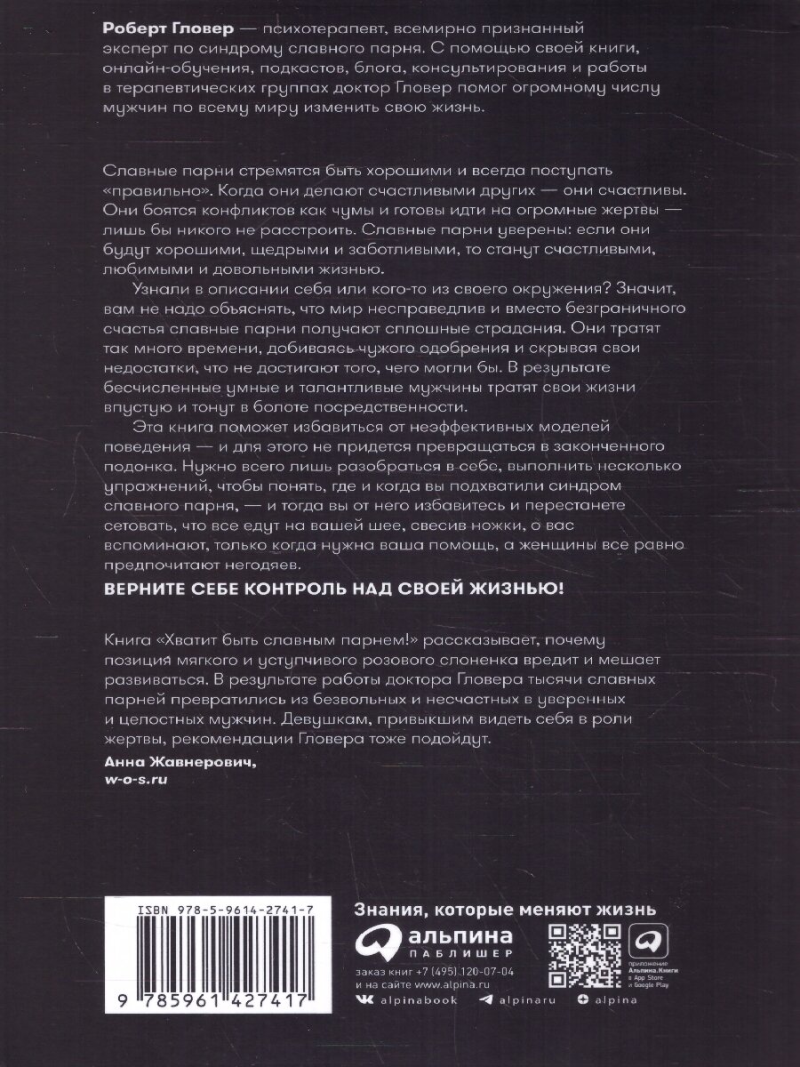 Книга очень полезная, и более того, наставляющая. Я сам и есть славный парень. Прочитав книгу, я очень многое понял о себе, ходе своих мыслей, о своей модели поведения. Доктор Гловер объясняет все предельно простым и понятным языком (за прочтение книги, не встретил ни одного незнакомого мне слова, в отличии от книг на похожую тематику других писателей). Следуя упражнениям предоставленным автором, я действительно начал ощущать изменения в себе.