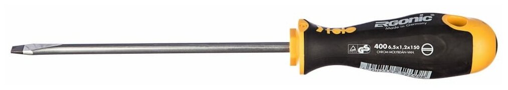Отвертка Felo шлицевая предназначена для монтажно-демонтажных работ с крепежом сечения SL 6,5.Рукоятка ERGONIC - первая в мире бесшовная рукоятка, которая адаптируется под руку любого пользователя, снижает нагрузку и утомляемость, а также увеличивает комфорт и максимальный крутящий момент. Продуманный дизайн рукоятки не позволяет инструменту скатываться с поверхности. Внешнее покрытие рукоятки имеет высокую устойчивость к царапинам и ГСМ.Отверстие в рукоятке позволяет для удобного хранения на стене, а также применять инструмент в качестве дополнительного рычага. На верхней части рукоятки указан тип шлица.Стержень изготовлен из высококачественной инструментальной стали, износостойкость и прочность которой превышает технические требования европейских стандартов DIN и ISO.