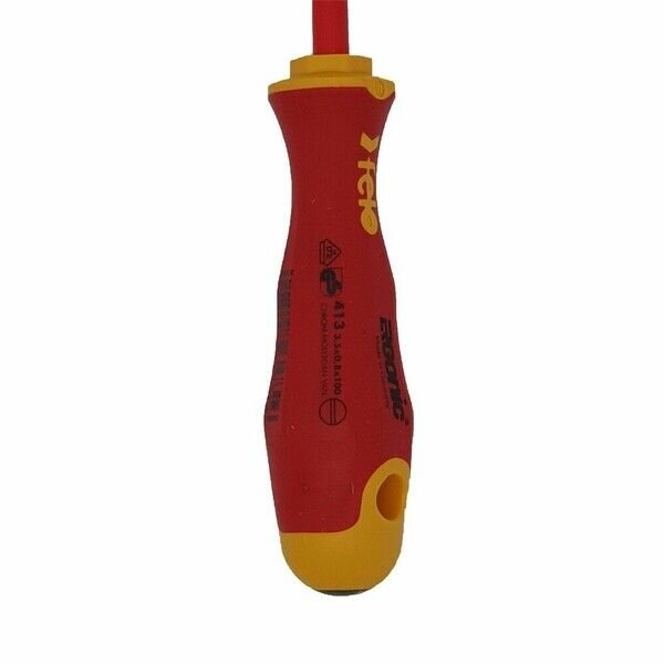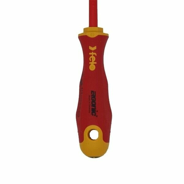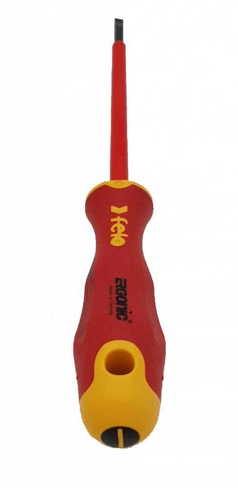 Диэлектрическая отвертка Felo шлицевая 3,5х0,8х100 предназначена для электромонтажных работ с крепежом типа SL 3.5 в электроустановках под напряжением до 1000 Вольт.Рукоятка ERGONIC - первая в мире бесшовная рукоятка, которая адаптируется под руку любого пользователя, снижает нагрузку и утомляемость, а также увеличивает комфорт и максимальный крутящий момент. Продуманный дизайн рукоятки не позволяет инструменту скатываться с поверхности. Внешнее покрытие рукоятки имеет высокую устойчивость к царапинам и ГСМ.Отверстие в рукоятке позволяет для удобного хранения на стене, а также применять инструмент в качестве дополнительного рычага. На верхней части рукоятки указан тип шлица. Стержень изготовлен из высококачественной инструментальной стали, износостойкость и прочность которой превышает технические требования европейских стандартов DIN и ISO.Все VDE отвертки сертифицированы в соответствии с DIN EN 60900, который требует, чтобы каждый отдельный инструмент был протестирован под напряжением 10.000 Вольт.