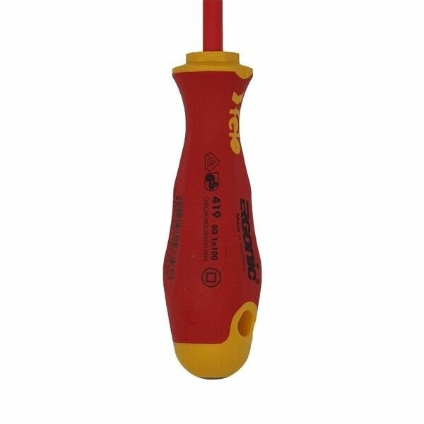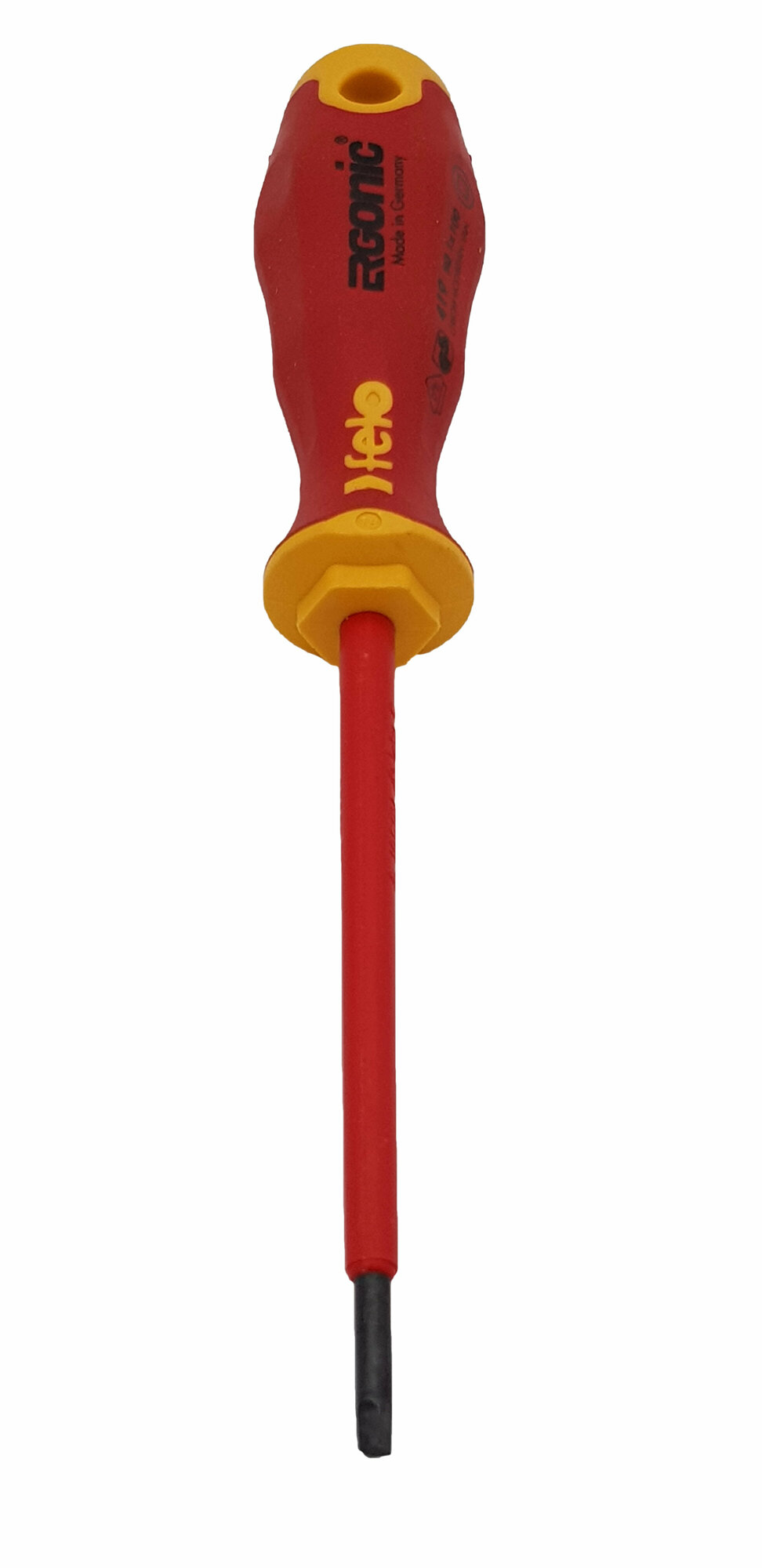 Отвертка используется при проведении электротехнических работ. Она проста и удобна в использовании благодаря своей эргономичной трёхкомпонентной ручке. Отвертка прошла 100% поштучный контроль, поэтому ей можно работать при напряжении до 1000 В. ERGONIC – первая в мире рукоятка, котороя адаптируется под руку пользователя. Отверстие в рукоятке выполнено для удобства хранения. Износостойкость превышает технические требования DIN и ISO вдвое. Ударопрочная сердцевина рукоятки проходит по всей длине отвёртки. Черный наконечник стержня необходим для наивысшей точности подбора типа.