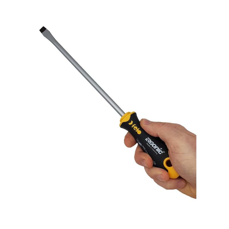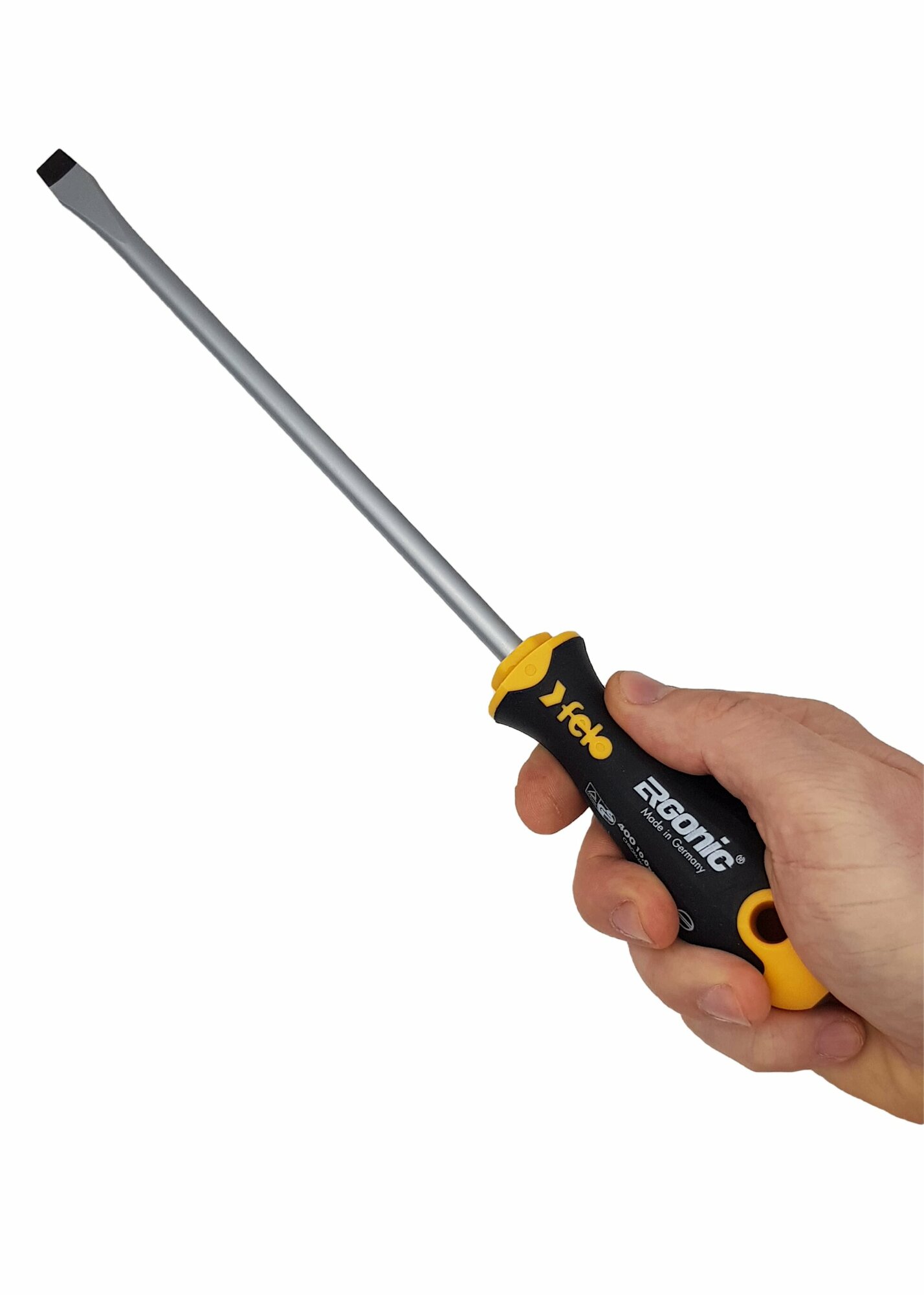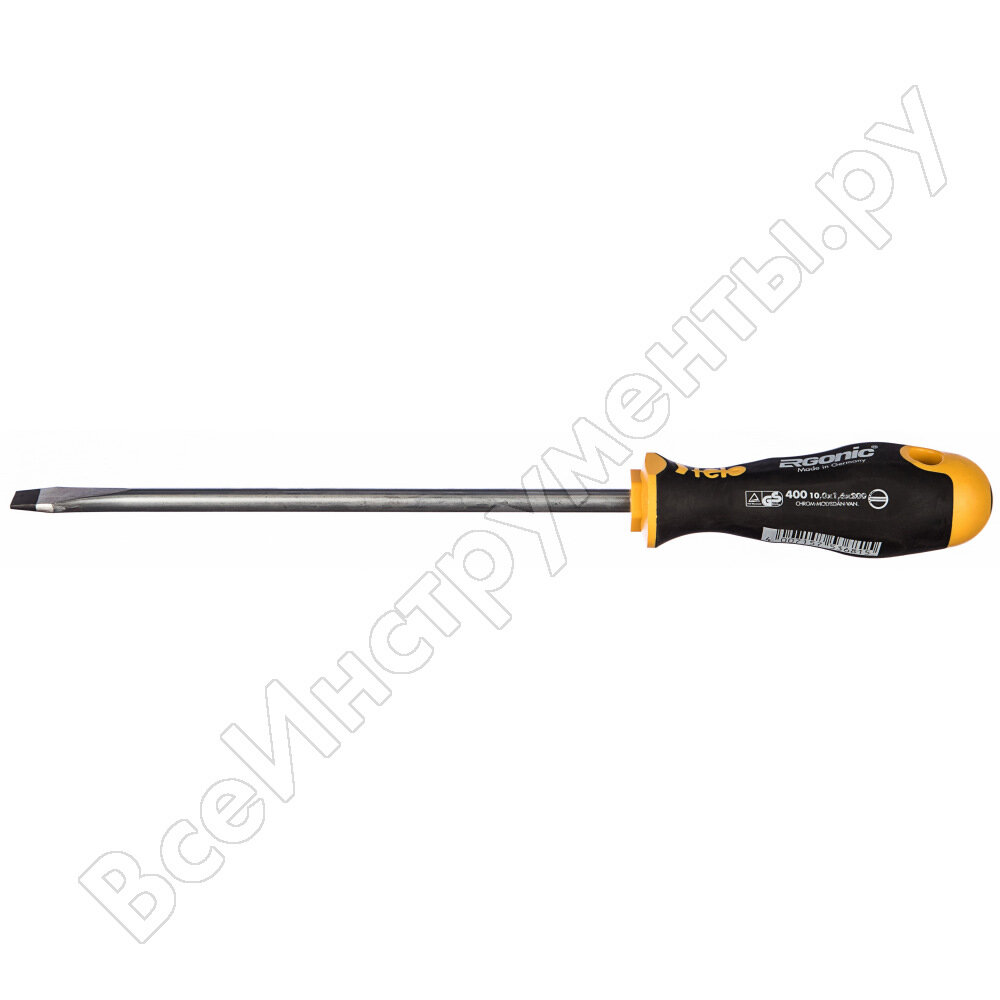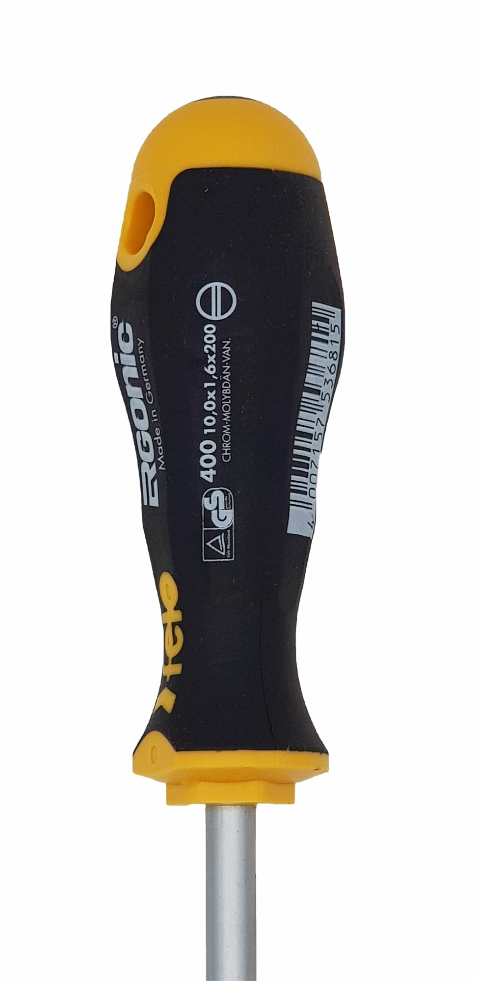 Отвертка серии 400 ERGONIC с эргономичной рукояткой, которая адаптируется под руку пользователя. Ручка отвёртки не содержит шва, что обеспечивает максимальный комфорт в работе. Исполненный дизайн рукоятки не позволяет инструменту скатываться с поверхности. Стержень отвертки полностью изготовлен из хром-молибден-ванадиевой стали, закалённой в масле. На верхней части рукоятки нанесён символ, обозначающий тип наконечника. Износостойкость более, чем на 100%, превышает технические требования DIN и ISO. Черный наконечник стержня даёт для наивысшую точность. Материал рукоятки отвёртки - устойчивый эластомер со специальными пустотами для мягкого пластика. Контролировать вращающий момент помогает специальный материал ручки.