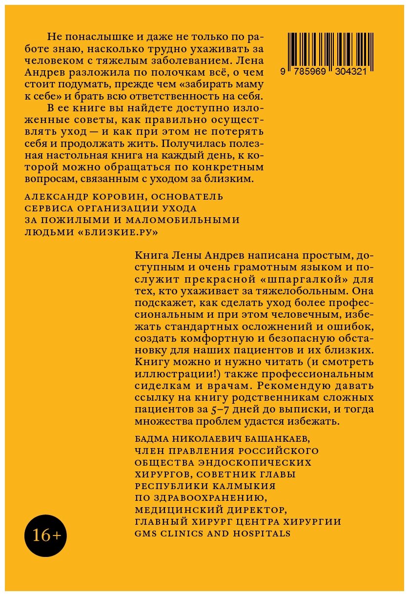 Думаю, все согласятся со мной, если я скажу, что уход за человеком с серьезной болезнью - это очень сложное как эмоционально, так и физически. Родственники и близкие человека, который внезапно заболевает, часто не знают, как правильно поступать в этой ситуации. Как раз для этого Лена Андрев и написала свою книгу. Здесь можно найти бесценные советы, касающиеся ухода за тяжелобольным человеком. Помимо практических советов здесь есть и много слов о поддержке больного. Ведь он по-прежнему остается человеком со своими желаниями, достоинствами и недостатками. И очень мало на сегодняшний день рассказано о том, как помочь больному в эмоциональном плане. Поэтому на эту книгу точно стоит обратить внимание, она в своем роде уникальна!