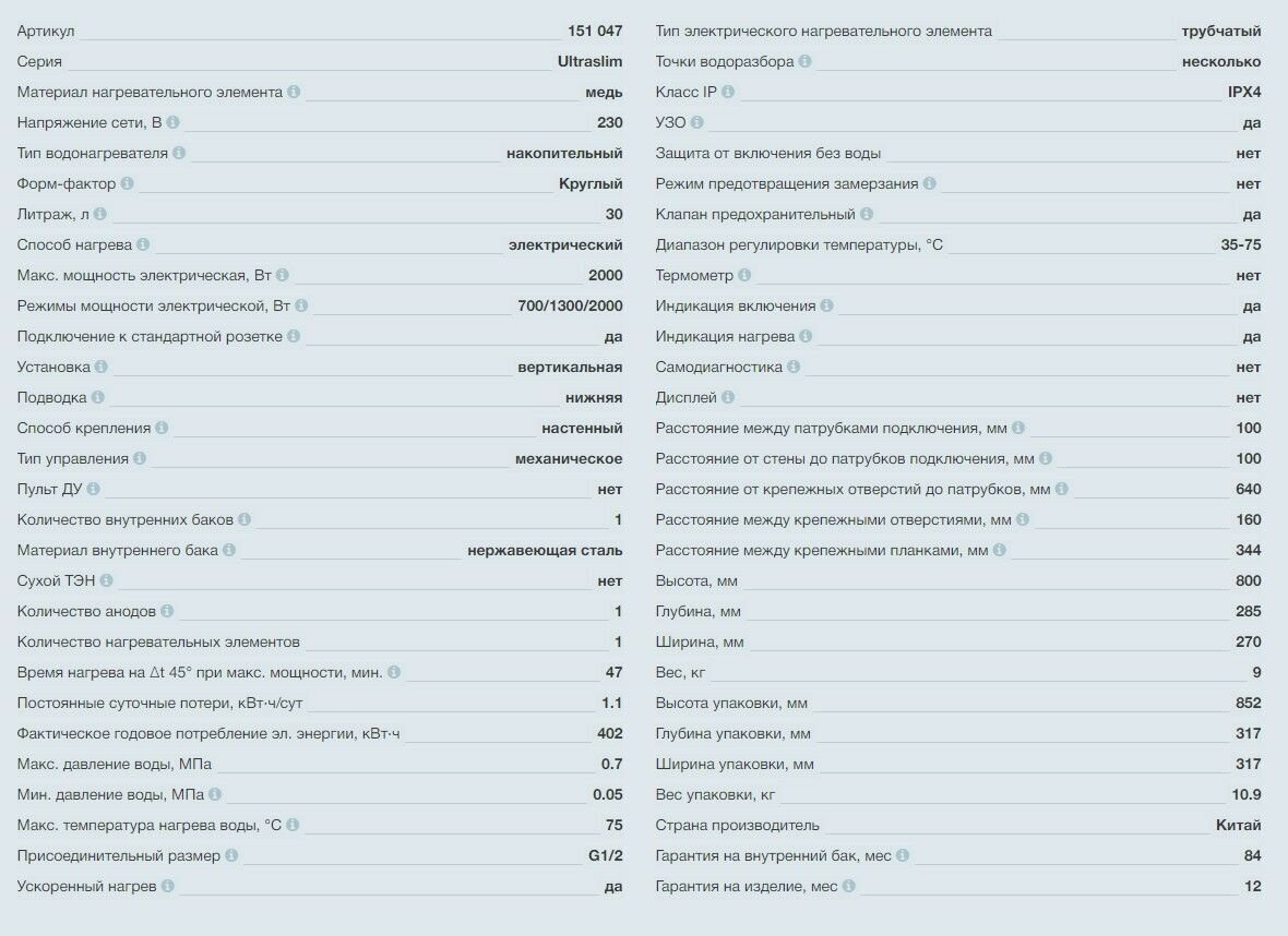 | Прочие особенности и свойства | Оригинальная серия водонагревателей с узким корпусом. Серия Ultraslim позволяет рационально использовать свободное пространство и установить водонагреватель в самых небольших помещениях.,,Компактность:диаметр 27 см помогает расположить водонагреватель даже в самых небольших ванных комнатах, кухнях, в угловых нишах и помещениях с нестандартной планировкой.,,Безопасность:внутренний бак из нержавеющей стали G.5 надежно защищен от образования коррозии, что обеспечивает стабильную и длительную работу водонагревателя.,,Гибкий нагрев |