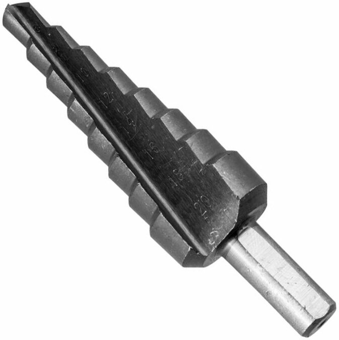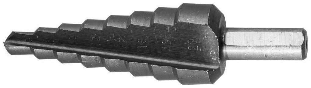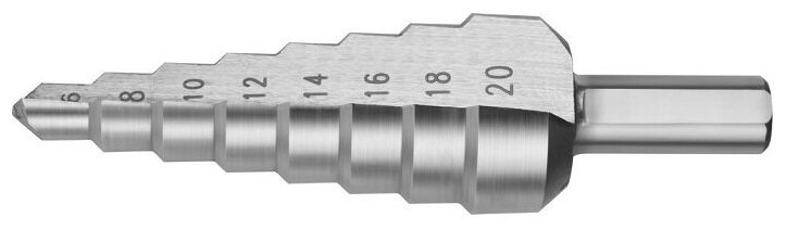 Сверло ЗУБР ступенчатое по сталям и цвет. мет. ст. Р6М5, d=6-20мм, 8ступ. d=6-8-10-12-14-16-18-20, L-75мм, 3-х гран.хв. 8мм
