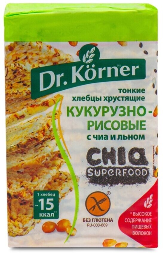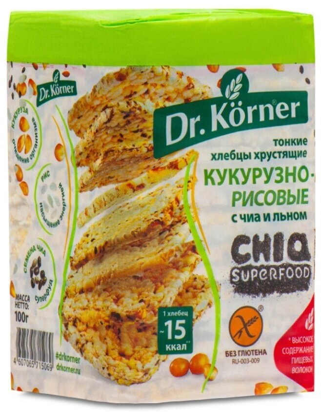 Хлебцы Dr.Korner Кукурузно-рисовые с чиа и льном без глютена 100г
