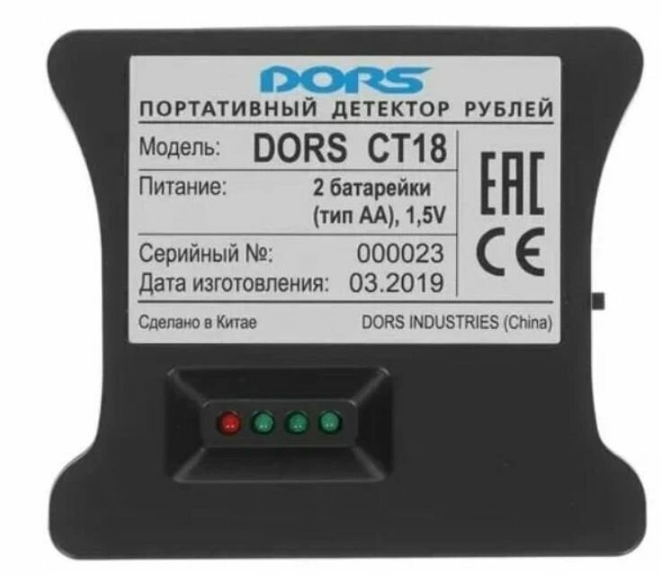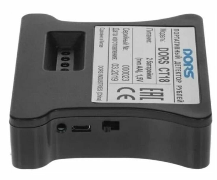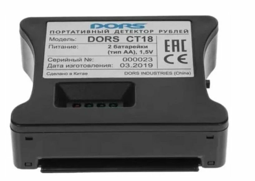 | Прочие особенности и свойства | DORS CT18 определяет подлинность российских рублей путем детекции антистокс-меток. Для проверки банкноты её необходимо вставить в щель детектора лицевой стороной (с нанесенными серийными номерами). Если банкнота имеет антистокс-метки (не является подозрительной)раздается звуковой сигнал и на корпус., , Проверяемая валюта - рубли, Антистокс детекция, Наличие звукового сигнала |