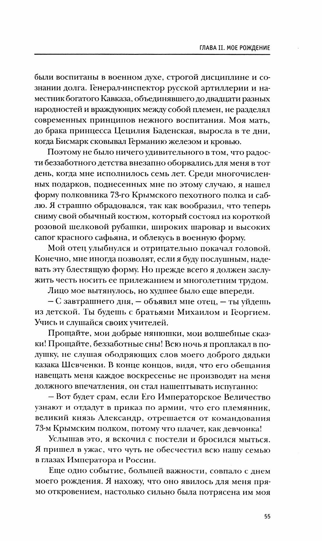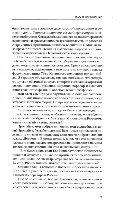 Отличное издание уже довольно известных воспоминаниях двоюродного дяди Императора Николая II, который написал в эмиграции двухтомные воспоминания о жизни до и после падения монархии в России. Великий Князь был в своё время другом святого Государя и некоторое время активно участвовал в руководстве русским флотом. В годы Первой Мировой войны он стал одним из создателей Российского военно-воздушного флота, крупнейшего в мире в то время и первым получившего целые эскадрильи бомбардировщиков. Воспоминания очень живые, крайне захватывающие, но очень субъективные и полностью им доверять, конечно же, не стоит. Любопытными представляются и многочисленные документы в приложении.