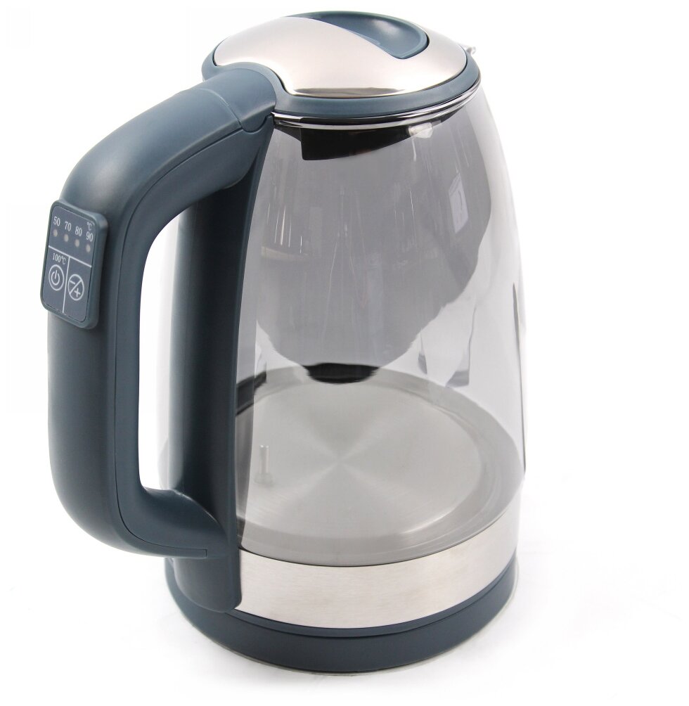 Купили на смену старому чайнику. Смотрится довольно не плохо. При включении загорается синяя подсветка. Температуру можно выставить на 60-90 градусов. При отсутствии воды не включается, при закипании отключается автоматически. Объема нам достаточно - 1,7 литра. Сам сделан из стекла, поэтому посторонних запахов нет.