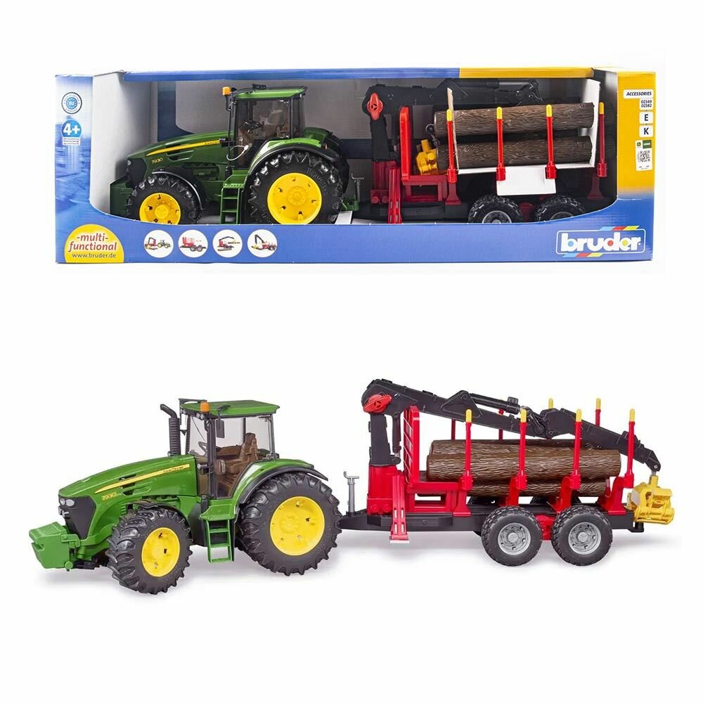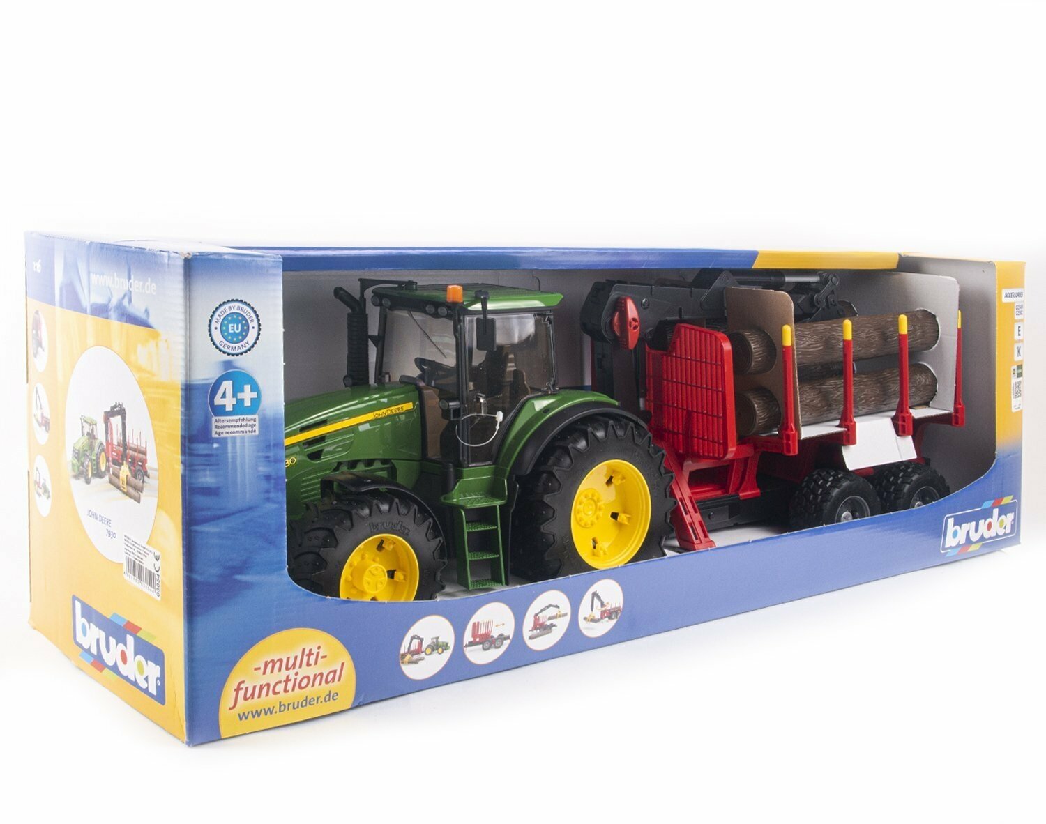 Еще больше интересных игр в лесозаготовку с новым набором от BRUDER. Трактор John Deere предназначен для тяжелых нагрузок, с номинальной мощностью 245 л. с. и объемом 6.8 литров. Детальная модель от BRUDER имеет застекленную кабину с открывающимися дверями, отделяемым передним весом, внедорожной, управляемой передней осью. Уникальная рулевая система с выдвижением рулевого колеса через крышу кабины также делают этот трактор легким для игр аленькими детьми, несмотря на застеклённую кабину. Модель оснащена поворотным погрузочным краном, который не только транспортирует стволы деревьев, но и загружает и разгружает их. Благодаря своим внедорожным осям, прицеп легко справляется даже с труднопроходимой местностью.