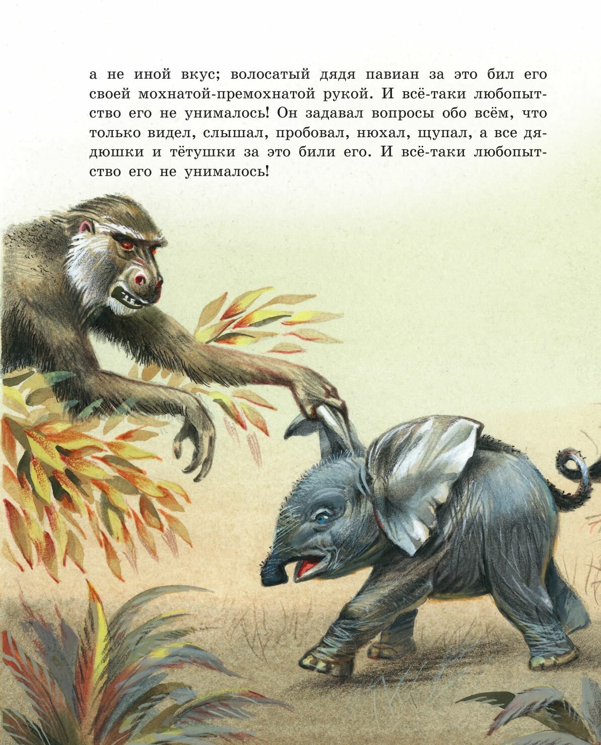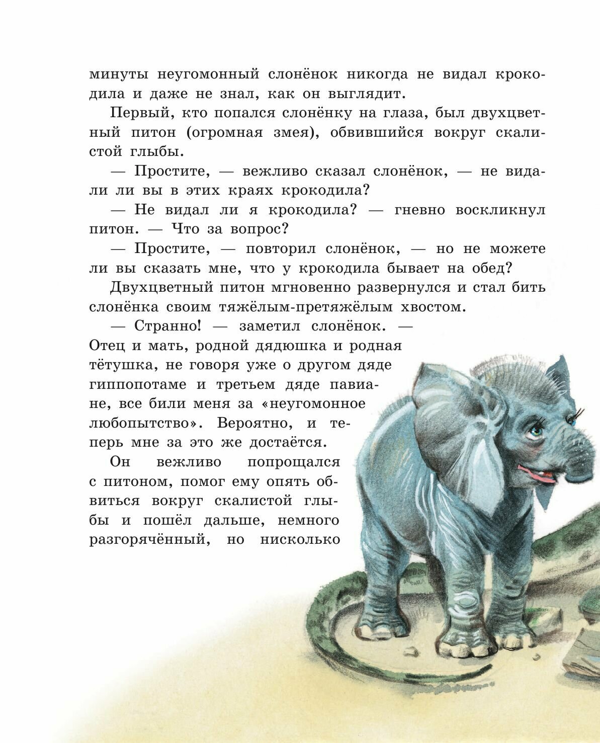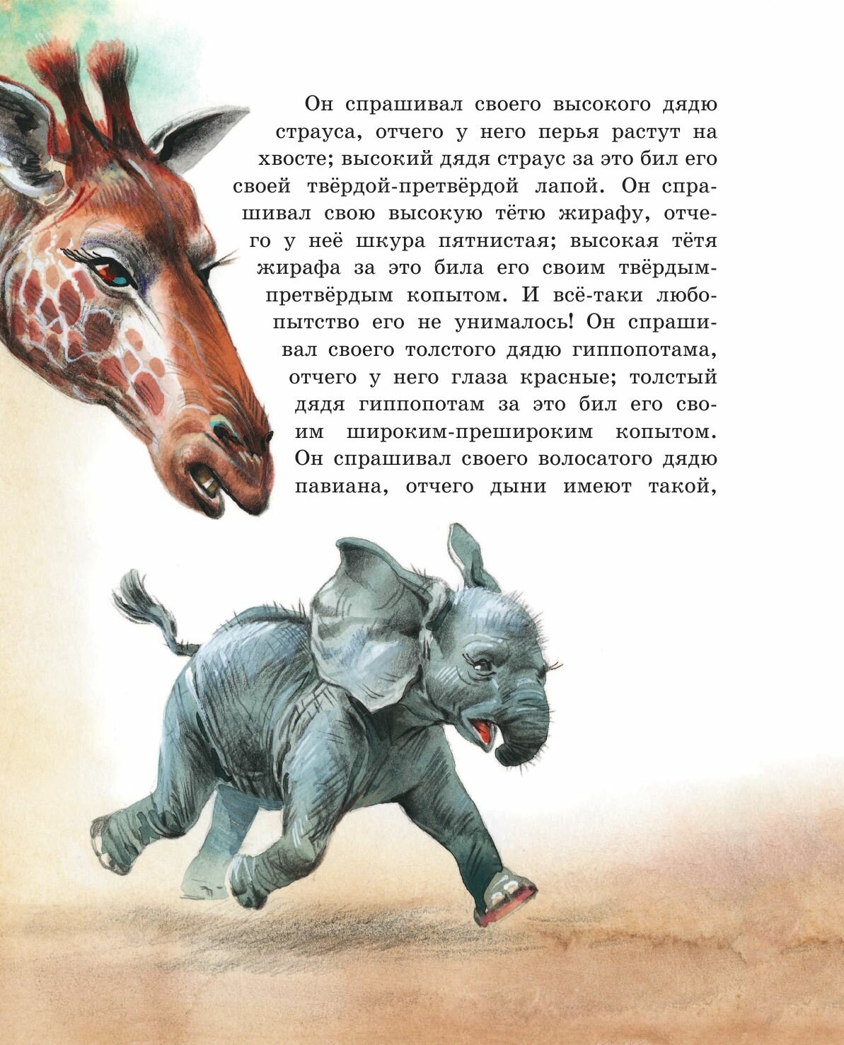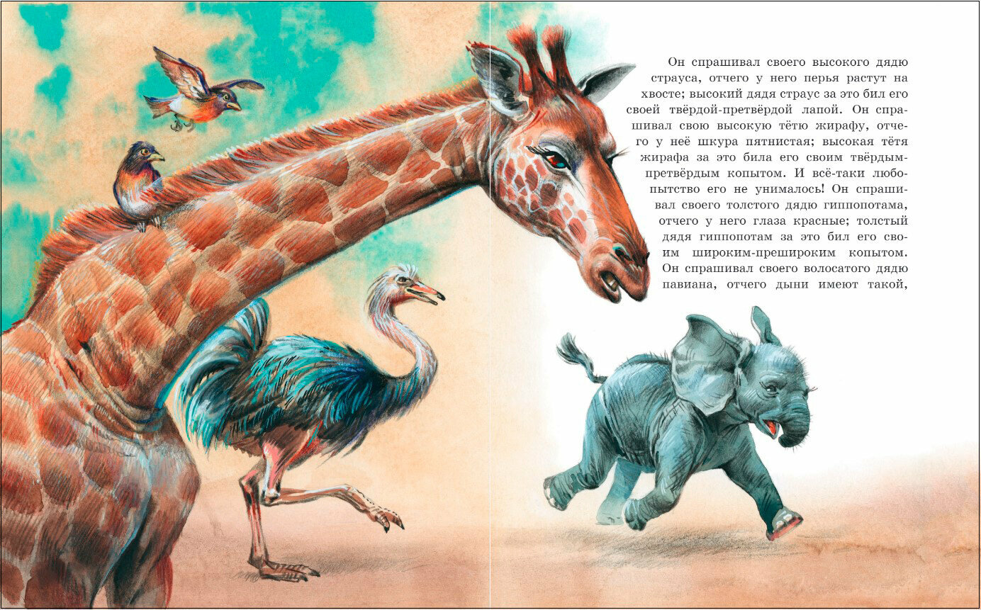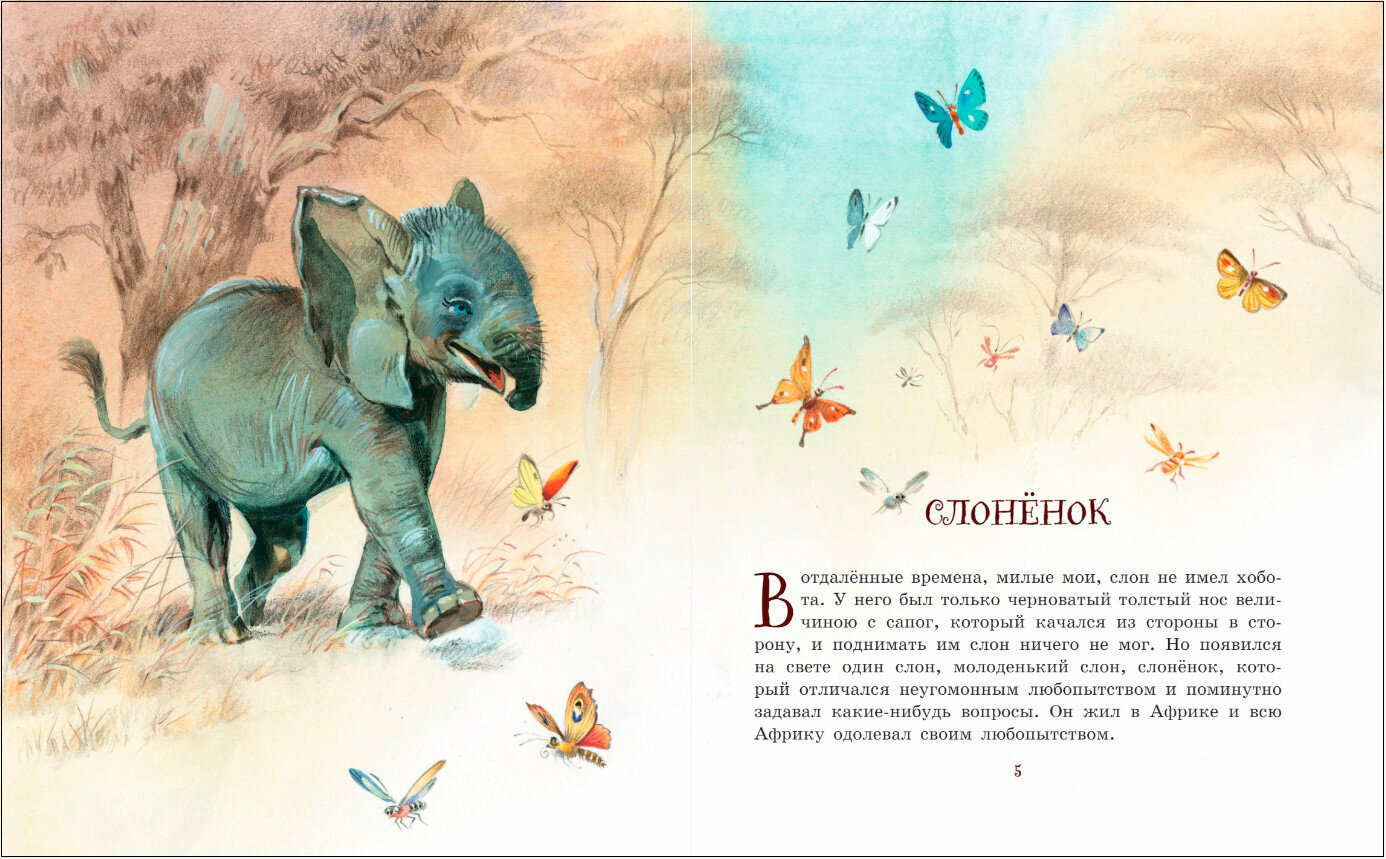"Но вот в то самое время, давным-давно, жил один такой Слон, или, лучше сказать, Слонёнок, который был страшно любопытен, и кого, бывало, не увидит, ко всем пристаёт с расспросами. Жил он в Африке, и ко всей Африке приставал он с расспросами.