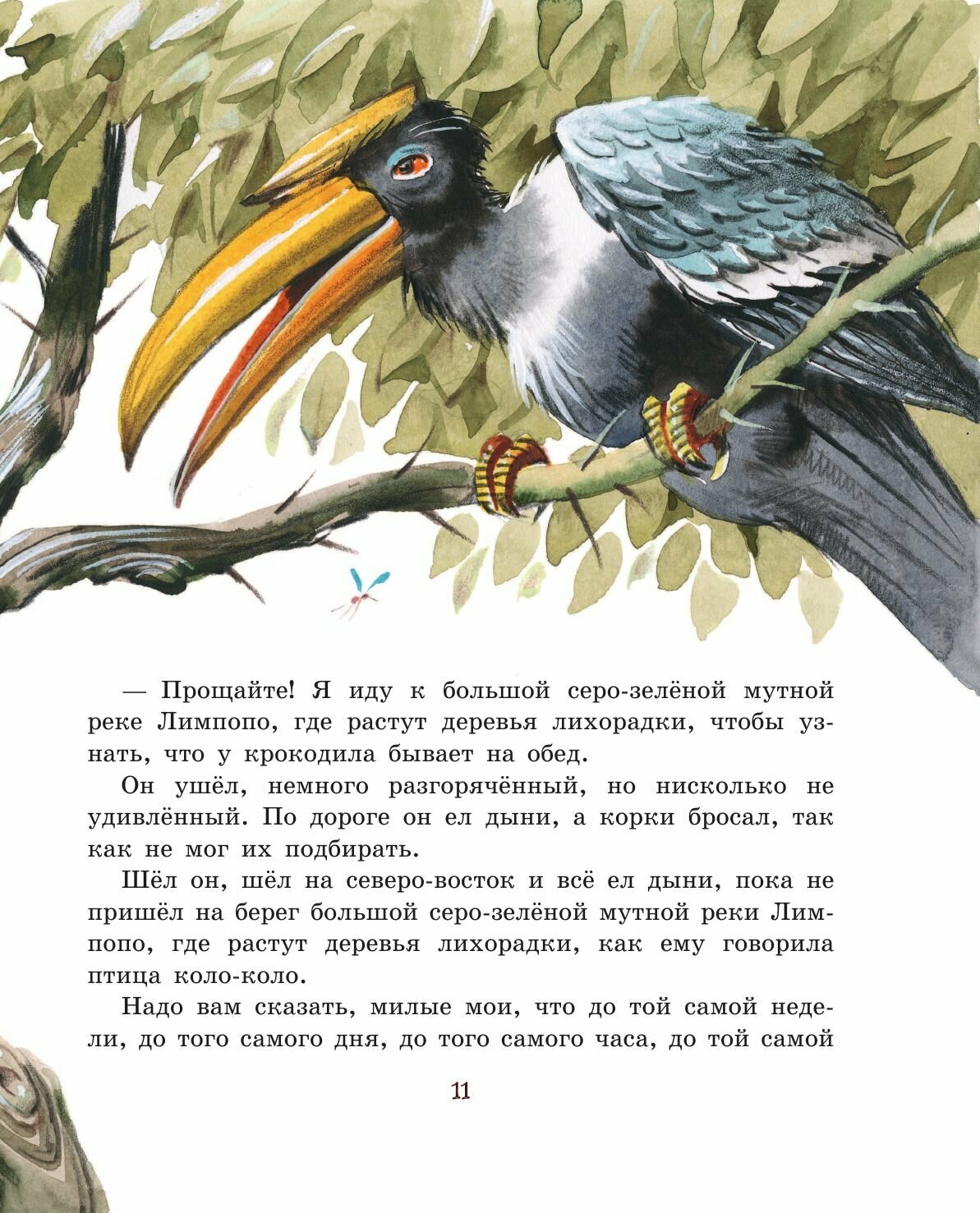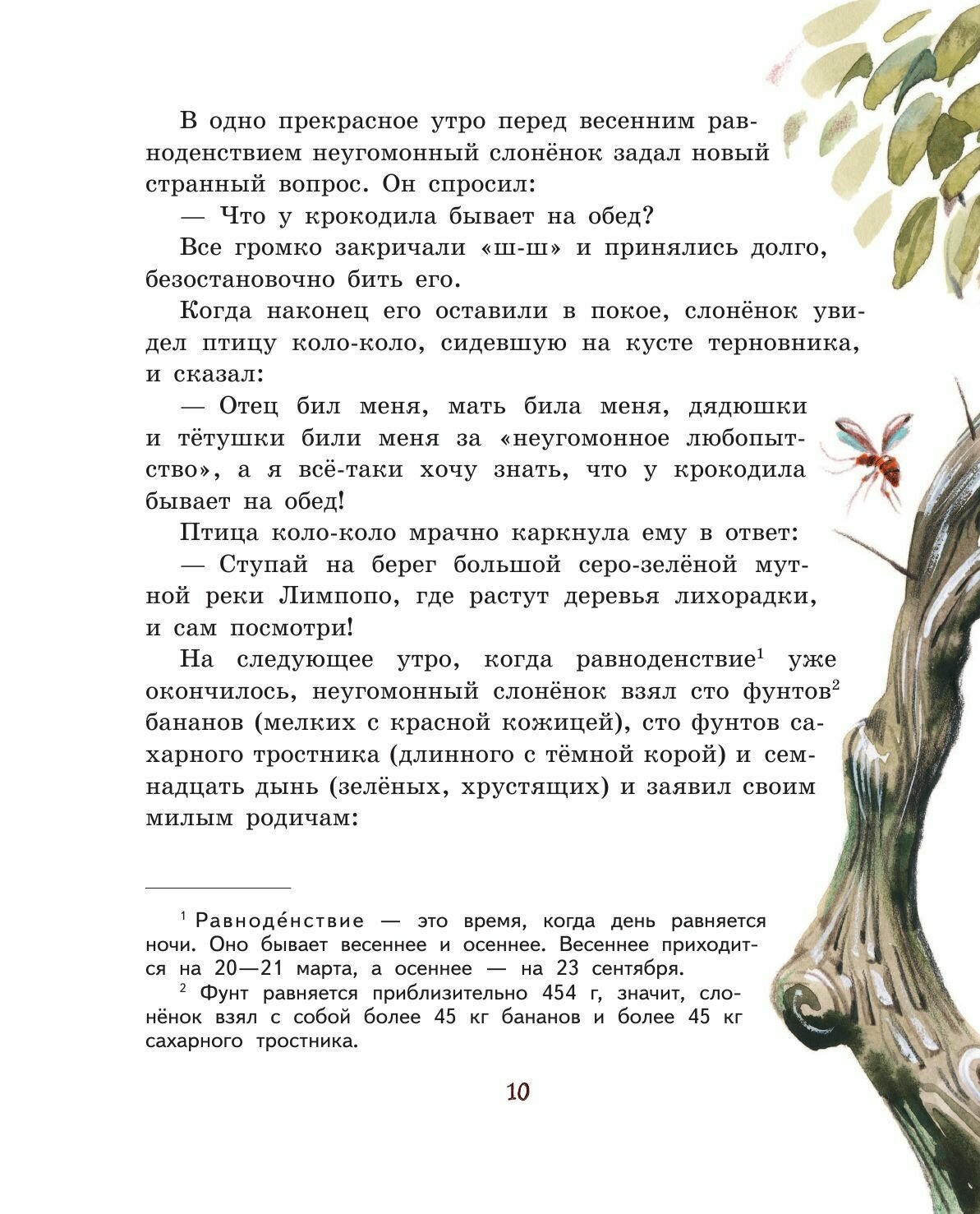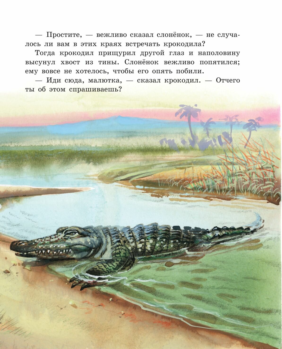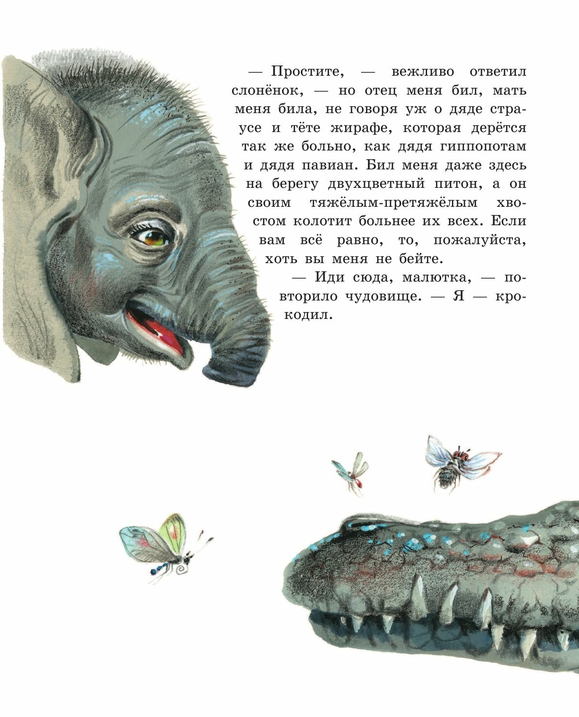 "Но вот в то самое время, давным-давно, жил один такой Слон, или, лучше сказать, Слонёнок, который был страшно любопытен, и кого, бывало, не увидит, ко всем пристаёт с расспросами. Жил он в Африке, и ко всей Африке приставал он с расспросами.