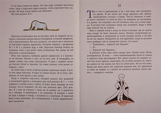 Ах, какая книжища!... Формат больше А4, тисненая обложка с частичной лакировкой, и иллюстрации... Картины... Миры... Ника Гольц превзошла себя. Мы привыкли к её сказочным королям-принцессам с вытянутыми наклоненными головками и в смешных кружевах, а тут... Нужно смотреть вживую, и большой формат здесь только помогает окунуться в другое измерение. Про само произведение не говорю, кто-то считает его величайшей философской притчей, а кому-то даже и скучновато может показаться, но равнодушным оно точно не оставит. Конечно, цена кусачая, но ЭТА книга того стоит! При всем уважении к каноническим иллюстрациям автора, мой Маленький принц - он вот такой, от Ники Гольц!