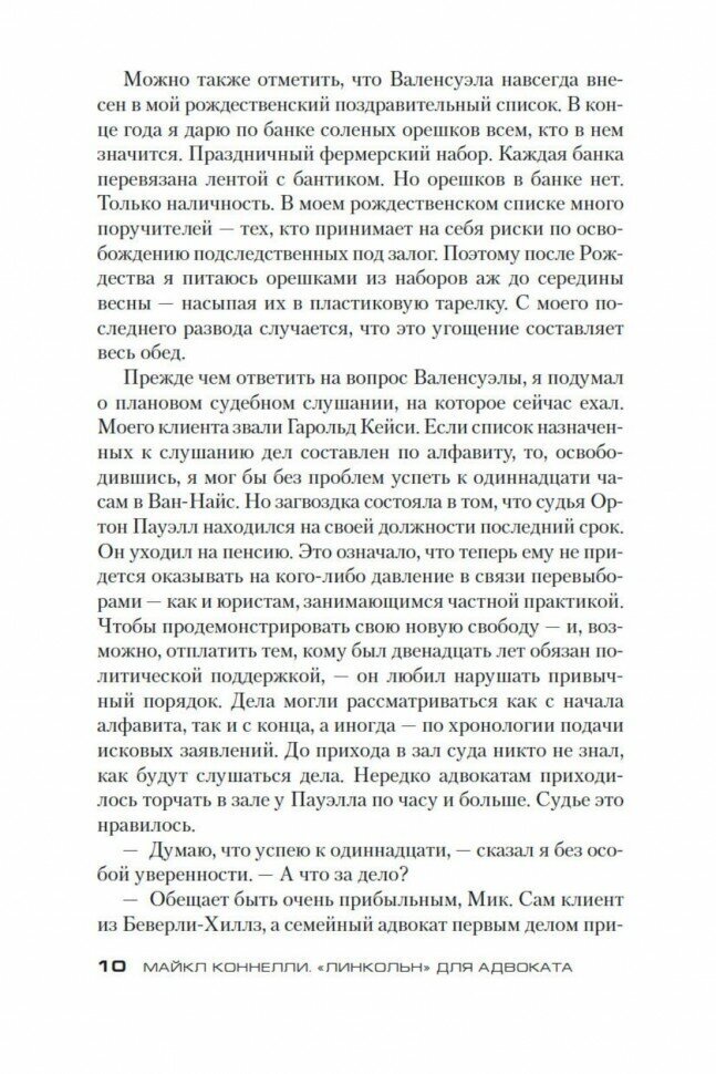 Очень американская книга...Автор пытается усидеть на двух стульях,показать честного адвоката,который берется за самые безнадежные дела,руководствуясь прежде всего моральными принципами.Получается так себе,не такая это профессия.Первая книга серии,самая сильная.Много диалогов,хорошо показана адвокатская \"кухня\".Про его родственника детектива Босха книги более разноплановые,\"Азбука\" их тоже издает.Пишет Коннелли хорошо,все по делу,сюжет нигде не провисает.В общем,читайте,думайте...