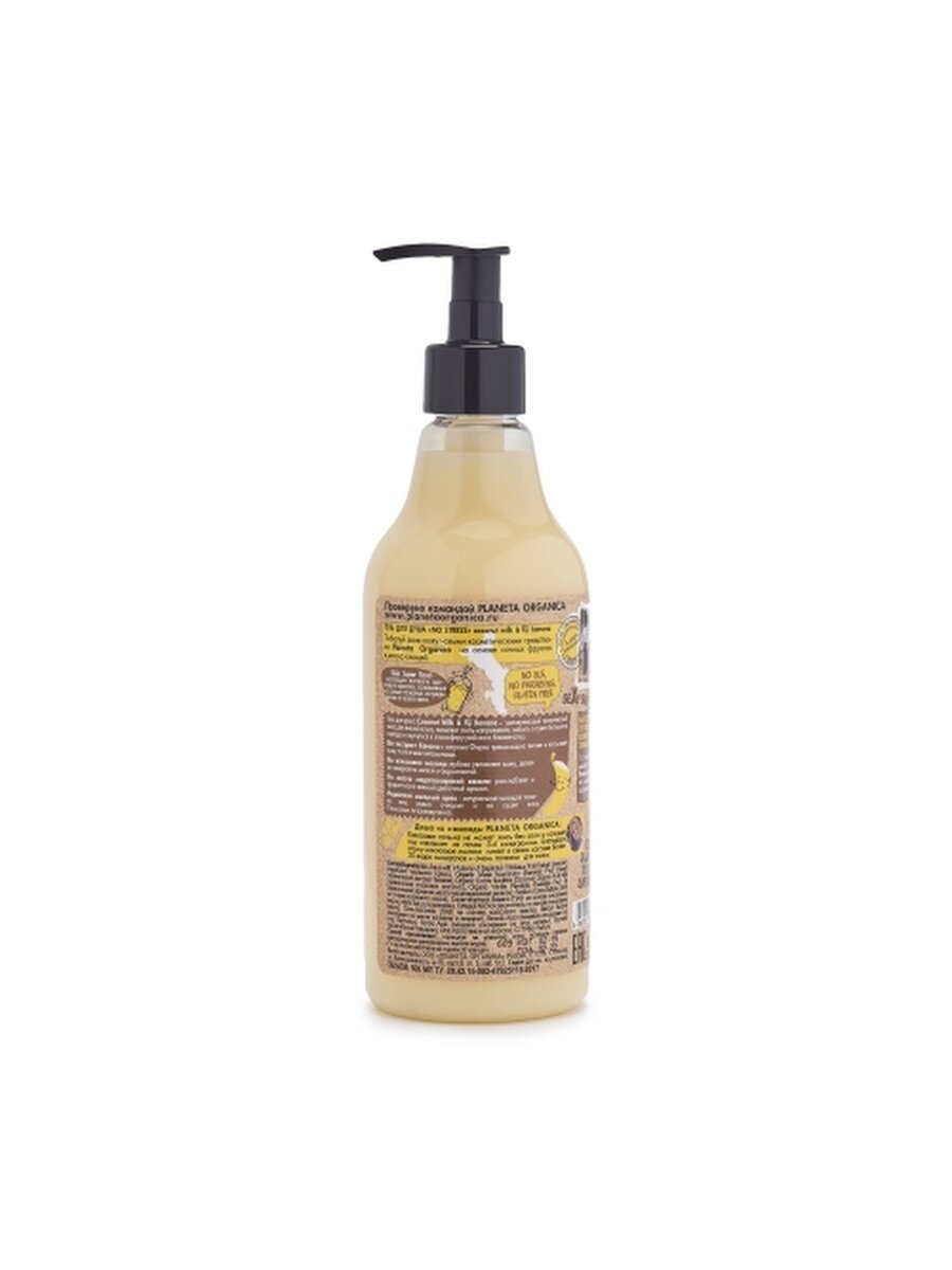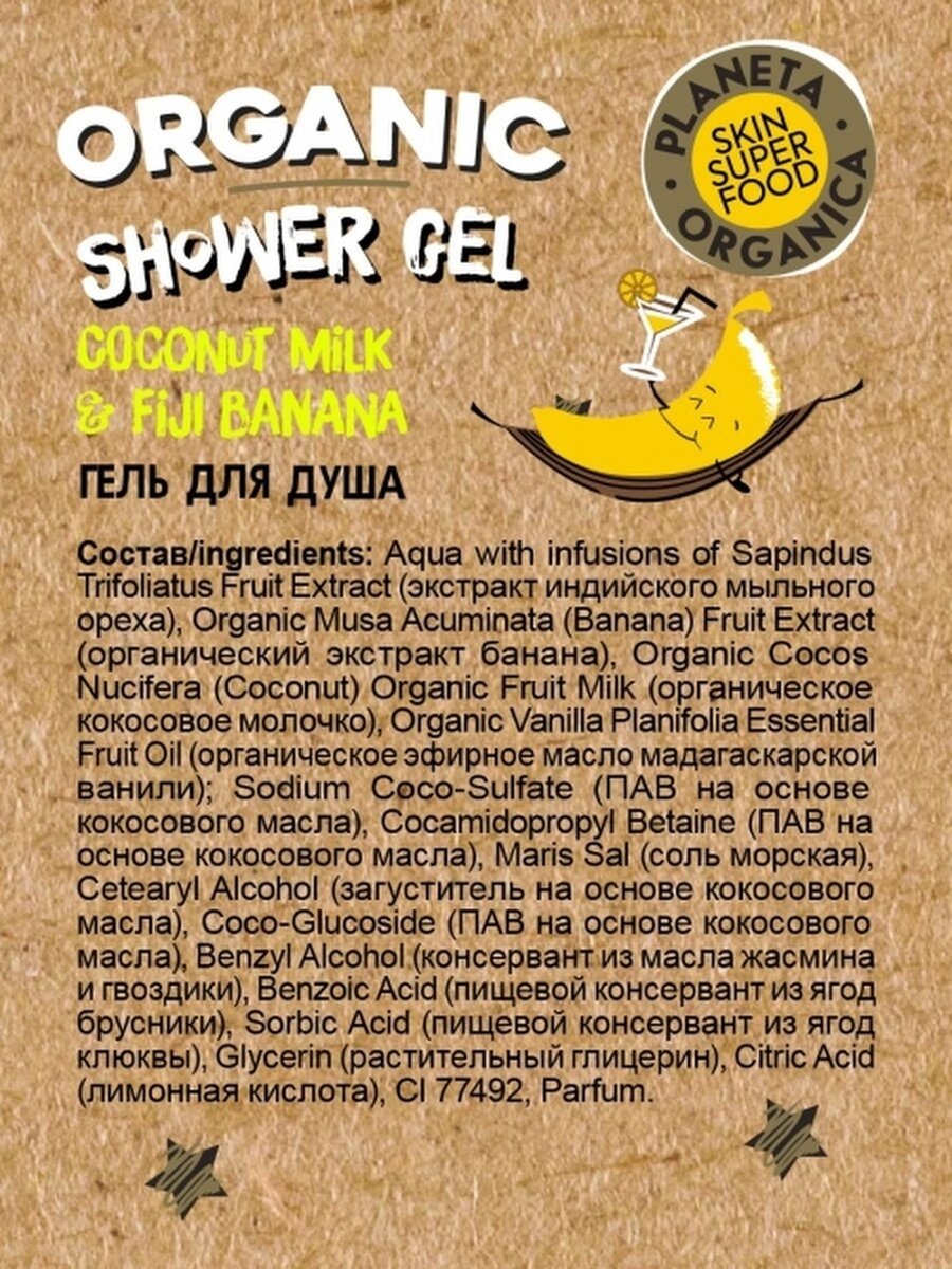 | Состав | Aqua with infusions of Sapindus Trifoliatus Fruit Extract (экстракт индийского мыльного ореха), Organic Musa Acuminata (Banana) Fruit Extract (органический экстракт банана), Organic Cocos Nucifera (Coconut) Organic Fruit Milk (органическое кокосовое молочко), Organic Vanilla Planifolia Essential Fruit Oil (органическое эфирное масло мадагаскарской ванили); Sodium Coco-Sulfate (ПАВ на основе кокосового масла), Cocamidopropyl Betaine (ПАВ на основе кокосового масла), Maris Sal (соль морская), Cetearyl Alcohol (загуститель на основе кокосового масла), Coco-Glucoside (ПАВ на основе кокосового масла), Benzyl Alcohol (консервант из масла жасмина и гвоздики), Benzoic Acid (пищевой консервант из ягод брусники), Sorbic Acid (пищевой консервант из ягод клюквы), Glycerin (растительный глицерин), Citric Acid (лимонная кислота), CI 77492, Parfum. |