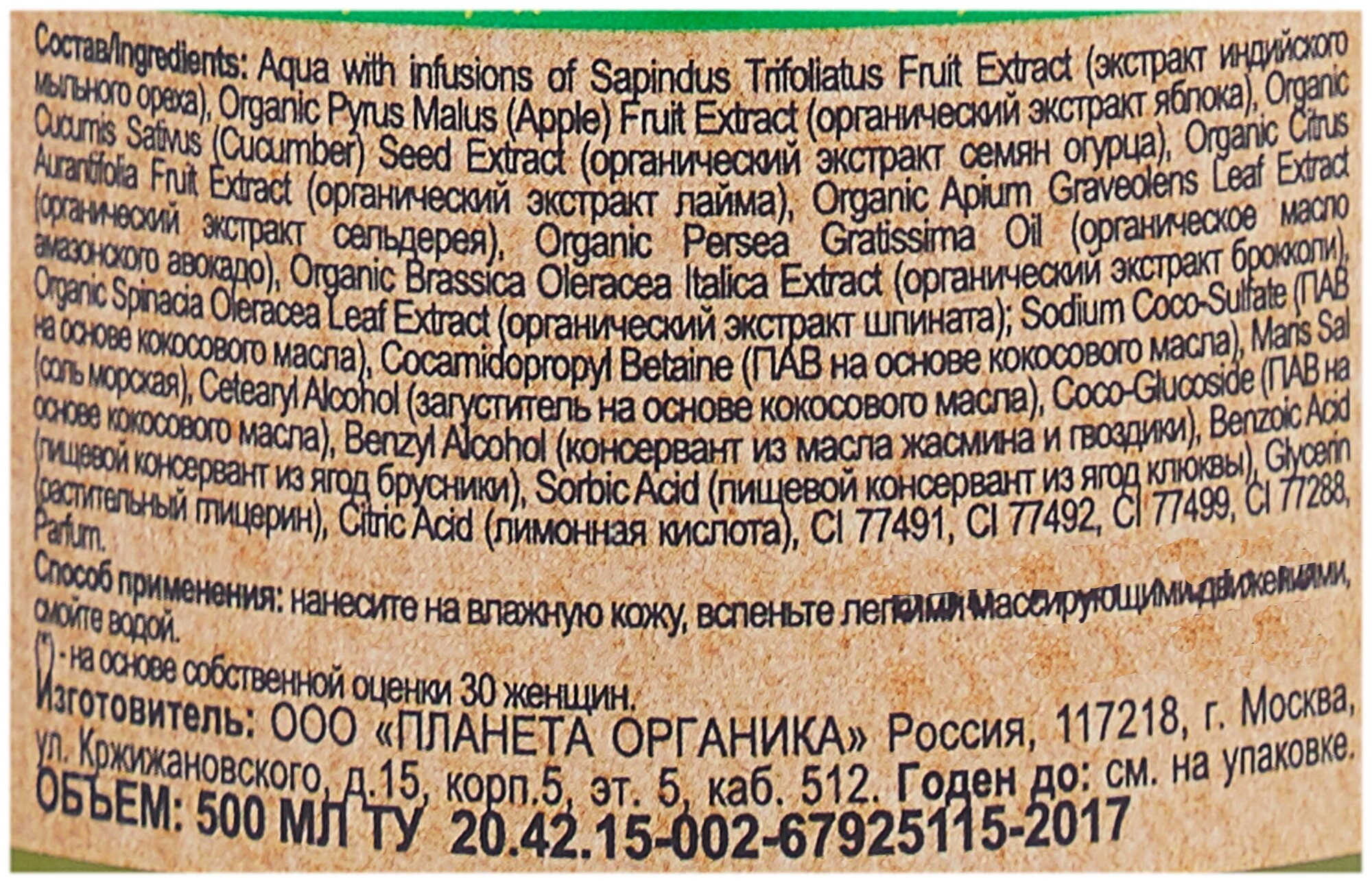 | Состав | Aqua with infusions of Sapindus Trifoliatus Fruit Extract (экстракт индийского мыльного ореха), Organic Pyrus Malus (Apple) Fruit Extract (органический экстракт яблока), Organic Cucumis Sativus (Cucumber) Seed Extract (органический экстракт семян огурца), Organic Citrus Aurantifolia Fruit Extract (органический экстракт лайма), Organic Apium Graveolens Leaf Extract (органический экстракт сельдерея), Organic Persea Gratissima Oil (органическое масло амазонского авокадо), Organic Brassica Oleracea Italica Extract (органический экстракт брокколи), Organic Spinacia Oleracea Leaf Extract (органический экстракт шпината); Sodium Coco-Sulfate (ПАВ на основе кокосового масла), Cocamidopropyl Betaine (ПАВ на основе кокосового масла), Maris Sal (соль морская), Cetearyl Alcohol (загуститель на основе кокосового масла), Coco-Glucoside (ПАВ на основе кокосового масла), Benzyl Alcohol (консервант из масла жасмина и гвоздики), Benzoic Acid (пищевой консервант из ягод брусники), Sorbic Acid (пищевой консервант из ягод клюквы), Glycerin (растительный глицерин), Citric Acid (лимонная кислота), CI 77491, CI 77492, CI 77499, CI 77288, Parfum. |