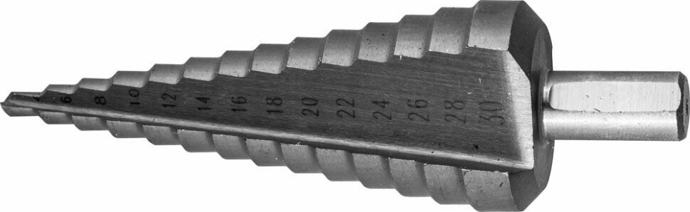 Сверло ЗУБР ступенчатое по сталям и цвет. мет. ст. Р6М5, d=4-30мм, 14ступ. d=4-30, L-100мм, трехгран. хв.10мм