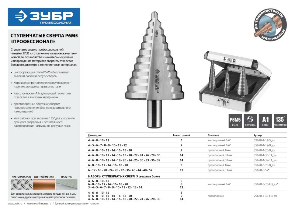 Ступенчатое сверло по сталям и цветным металлам ЗУБР 29670-4-30-14_z01