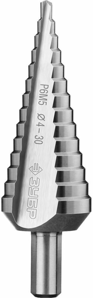 Сверло ступенчатое Зубр 4-30мм, HSS-R, быстрорежущая сталь М2(S6-5-2) Р6М5, класс А 14 ступеней