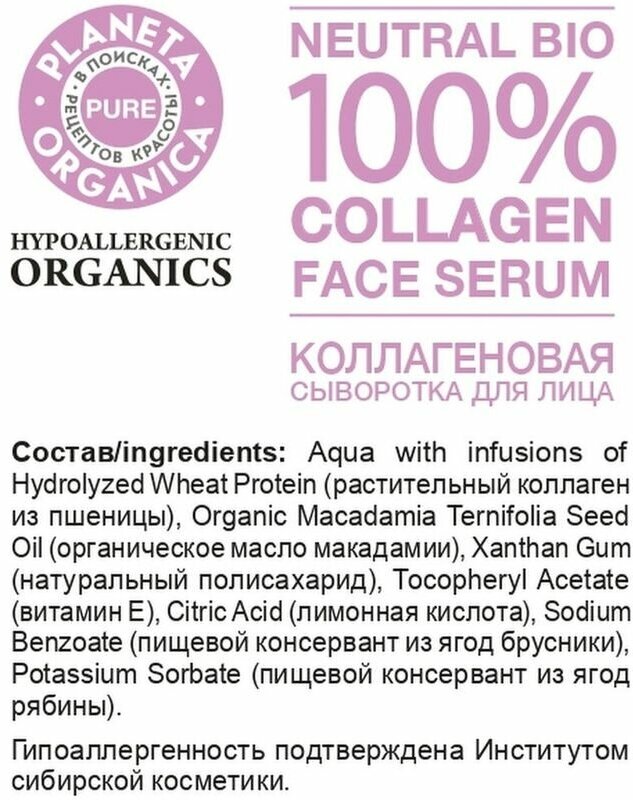 Коллагеновая сыворотка для лица интенсивно питает и восстанавливает кожу, возвращая ей молодость и сияние. Коллаген – это каркас кожи, который отвечает за упругость, молодость и красоту. С возрастом уменьшается выработка коллагена. После 30 лет организм человека каждый год теряет приблизительно 1% коллагена. Это приводит к потери тонуса, упругости и появлению морщин. Сыворотка содержит растительный коллаген из пшеницы, который легко проникает в кожу и омолаживает ее. Стимулирует выработку собственного коллагена, повышает упругость и эластичность кожи. Обладает мощным лифтинг- эффектом и придает четкие контуры и моделирует овал лица. Разглаживает мелкие и глубокие морщины. АКТИВНЫЕ ГИПОАЛЛЕРГЕННЫЕ КОМПОНЕНТЫ: Растительный коллаген из пшеницы омолаживает и обладает мощным лифтинг -эффектом. Органическое масло макадамии интенсивно питает и восстанавливает кожу. Витамин Е - природный антиоксидант, защищает от вредных факторов окружающей среды и УФ-излучений.