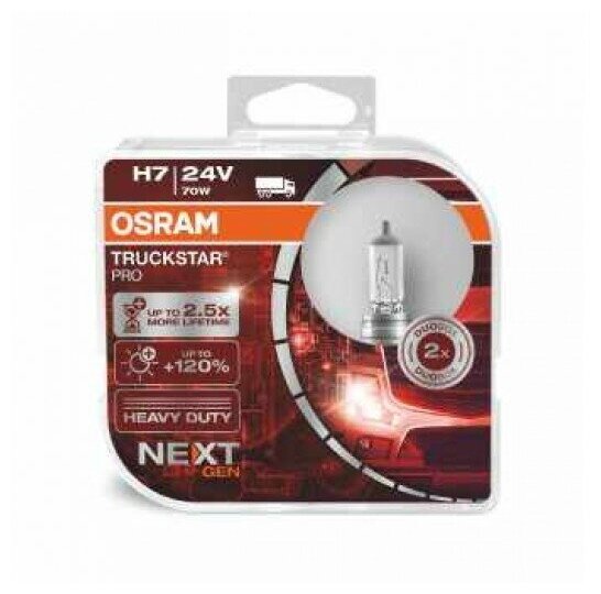 Фарная галогенная лампа OSRAM TRUCKSTAR PRO +100% 24V для грузовых автомобилей Фарные галогенные лампы накаливания OSRAM TRUCKSTAR PRO +100% 24V. Это новинка 2017 года галогенных ламп для коммерческого грузового транспорта с напряжением 24V. Которые имеют повышенную мощность свечения на +100% и яркость свечения. При изготовлении OSRAM TRUCKSTAR PRO используют материалы повышенного качества чтобы достичь повышенного срока службы более чем в 2,5 раза по отношению к стандартным фарным галогенным лампам накаливания фирмы OSRAM. Повышенная виброустойчивость в лампах OSRAM TRUCKSTAR PRO позволяет не выходить из строя на кочках и ямах на любых российских дорогах. За счет улучшения свечения и повышается безопасность на дорогах, у водителя меньше устают в дороге глаза при длительной езде. Применяются для освещения ближнего света, дальнего света, и противотуманных фарах (ПТФ) грузовых автомобилей. Самая яркая галогенная лампа OSRAM для коммерческого транспорта на 24 Вольта Откройте для себя TRUCKSTAR PRO – самые яркие сигнальные лампы OSRAM для коммерческого транспорта с оптимальным соотношением цены и качества. Это идеальное решение для профессионалов: на 100% больше света по сравнению со стандартными галогенными лампами, сверх длительный срок службы и высокая виброустойчивость позволяют экономить на замене ламп и времени простоя автомобиля в текущем ремонте. Благодаря вибростойкой конструкции эти 24-вольтные лампы подходят для самых трудных условий эксплуатации. А впечатляющая яркость и до 2,5 раз более длительный срок службы по сравнению со стандартными лампами гарантируют повышенную безопасность на дороге. Доступные цоколи ламп накаливания OSRAM TRUCKSTAR PRO +100% 24V: H1, H3, H4, H7, H11Потребляемая мощность фарной лампы OSRAM TRUCKSTAR PRO +100% 24 Вольта:70w, 75/70wАртикул фарных галогенных ламп OSRAM TRUCKSTAR PRO +100% 24V : H1 70w - 64155TSPH3 70w - 64156TSPH4 75/70w - 64196TSPH7 70w - 64215TSPH11 70w - 64216TSPЦена за комплект 2шт.