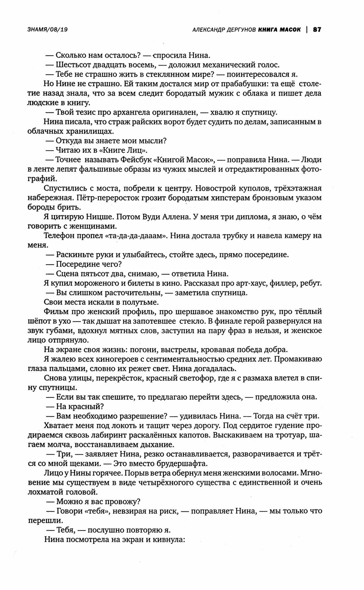 Комментировать можно исключительно с содержательной. Итак, августовский выпуск за 2019 год, характеризует калейдоскоп из стихов и прозы. Они чередуются между собой. Рассказ Александра Дергунова "Книга масок" - короткий, но в образной и живой форме поднимает тему первых знакомств, и как люди через социальные сети контруируют образы себя, отличные от повседневности - с визуальной и внутренней стороны. Ведь мы выбираем удачные ракурсы, постим некие мысли, которые считаем интересными, и вот...можем общаться он-лайн с человеком годами, а когда встречаем в реале - не сразу его и узнаем. И он нас тоже.