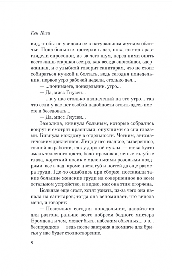Почему 8/10? Думаю, каждый из нас имеет право на личное мнение...у меня были "завышенные ожидания" от книги. Я думала, что прочитав "Над кукушкиным гнездом" мне приоткроется мир человека с психической болезнью: описание галлюцинаций и видений, симптомов болезней, передача мироощущения. Мне не хватило психологии и психиатрии в книге, но опять же, это не делает книгу плохой - ни в коем случае! У каждого свое мнение, возможно, именно вы прочтете ее и измените свой взгляд на мир. -