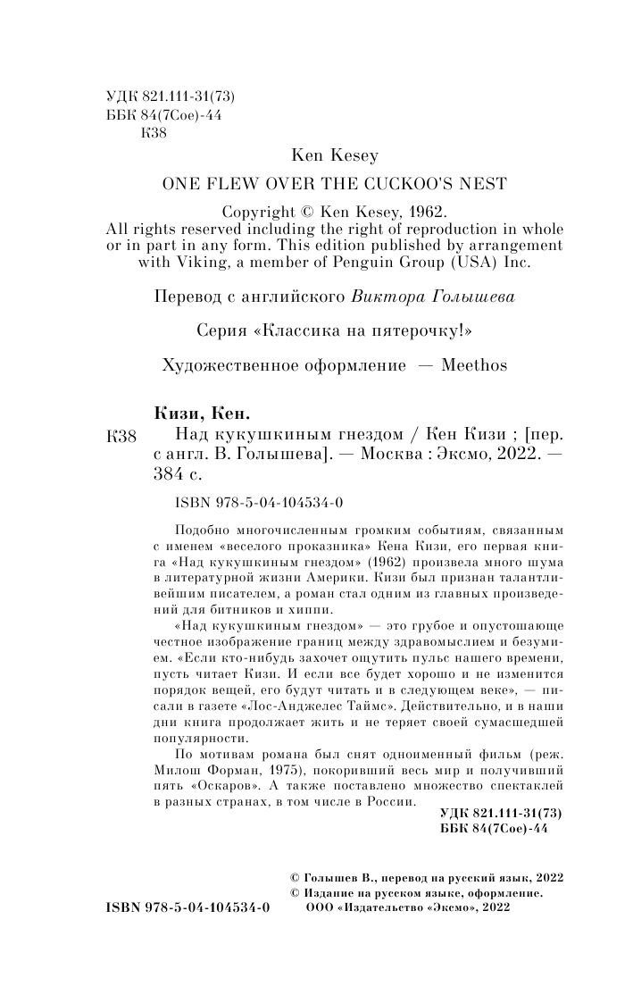 Книга: Над кукушкиным гнездом (Кен Кизи); Эксмо, Редакция 1, 2021