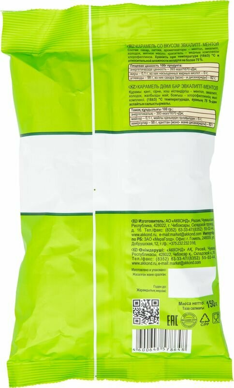 | Состав | Сахар, патока, ароматизаторы – ментол, эвкалипт, холодок, мятное масло, краситель – медные комплексы хлорофиллинов |