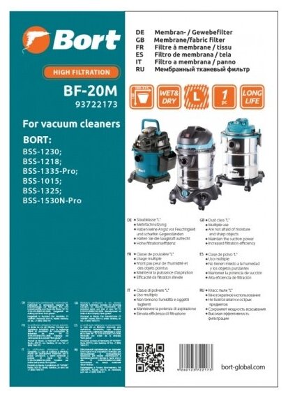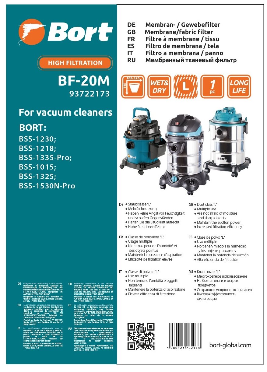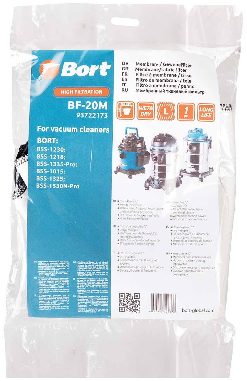 Фильтр для пылесоса тканевый Bort Универсальный мембранный фильтр изготовлен из плотного фильтровального материала для неоднократного использования. Применим к любым моделям пылесосов. Класс фильтрации «L».