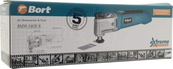 Реноватор Bort Многофункциональный инструмент BORT — легкое, эргономичное устройство, с помощью которого выполняется широкий спектр задач. Вам он пригодиться, если нужно совместить несколько инструментов в одном – пассатижи, отвертка, нож, ножницы, пила или шлифовальная машина. Эта модель оптимальна при выпиливании в труднодоступных местах. Она входит в высококачественную серию eXtreme, которая отличается усовершенствованными характеристиками и гарантией долгого срока эксплуатации. Небольшой вес и эргономичный корпус позволяют работать с удобством и комфортом долгое время. Мощность двигателя 240 Вт и регулировка оборотов от 15 000 до 22 000об/мин обеспечивают работу в нужном вам режиме. Осуществить быструю замену необходимой оснастки можно за счет функции бесключевой смены оснастки. В комплекте с мультитулом идут: дополнительная рукоятка, погружное пильное полотно, жесткий шабер, подошва шлифовальная и сменные листы для нее, шестигранный ключ.