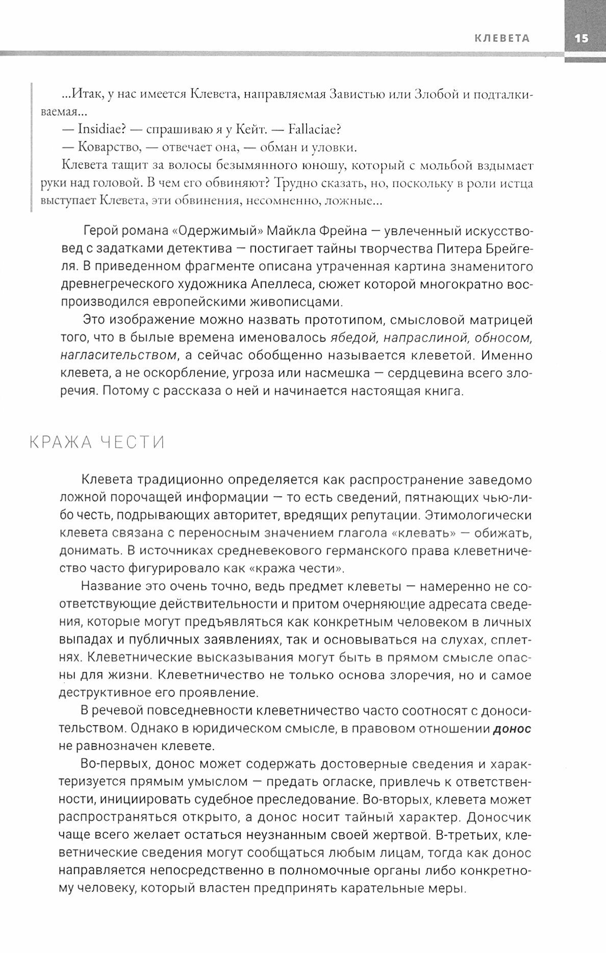 Капитальный труд на 624 стр. Вес монографии: около 1,5 кг. Научная книга с элементами «вольного стиля». Автором проделана гигантская работа. Солидный список использованной литературы. Да и сама тема – необъятная. Со злословием мы сталкиваемся на каждом шагу. Клевета, оскорбления, проклятия, сплетни и слухи, осуждение и критиканство, угрозы и шантаж, насмешки, глумление, хамство, богохульство и кощунство, сквернословие, вражда, ксенофобия, троллинг и др. В книге подробно «разобраны» различные формы проявления злоречия с экскурсом в историю, изобразительное искусство и литературу… «Злословец – самый лютый из диких зверей» (Диоген)… «Никакого порока нет злее клеветы» (Менандр)… «На свете нет лекарств против клеветы» (Мольер)… «Клевета что уголь: не обожжёт, так замарает» (Пословица)… «Злобный доносчик может самое невинное слово обратить в уголовное преступление…» (Адмирал Н.С. Мордвинов)... «Доносчики нетерпимы, но доносы полезны» (Екатерина II)… В книге не всё однозначно. С какими-то аргументами сложно согласиться. Например, в статье «К боярину с наветом» сказано: «Европейцы подмечали особую национальную страсть русских… у них (московитов) вошло в обычай обвинять и клеветать друг на друга… и пылать ненавистью один к другому…» В общем, нехорошо отзываются. Ладно, это иностранцы. Что с них взять. Они испокон веков упражняются в злоречии в отношении России и русских. А что автор? «Ровно то же самое подмечали затем отечественные историки», и ссылается на не самого авторитетного П.К. Щебальского: «Страсть или привычка к доносам есть одна из самых выдающихся сторон характера наших предков». Так ли? Давайте просто вспомним пословицы: «Доносчику – первый кнут… Бог любит праведника, а чёрт – ябедника… Кто станет доносить, тому головы не сносить…» То есть русские пословицы нам говорят совсем иное. Далее. Глава 2. В статье «Поцелуй корову в…» автор скрупулезно перечисляет всевозможные оскорбления, в том числе и самые непристойные. Мало того, нецензурная лексика нашла себе место и в главе 13 «Потребность непотребства. Сквернословие». Зачем??? Какая была в том потребность? Неужели нельзя было это как-то завуалировать, подобрать более пристойные слова или просто сократить текст в данной части? Присутствие ненормативной лексики автор объясняет «необходимостью объективного и достоверного предъявления словесного материала» и «научной этикой», предписывающей цитирование без купюр. Представляется, что доводы автора неубедительны. Суть оскорблений и сквернословий ясна и понятна и без непристойностей. В книге «нарисована» полная картина «Злоречия». Мрачная. Злоречие – дорога в ад? Но что делать? Ратовать за «чистоту речи» и выступать против «словесной грязи»? Или оставить всё, как есть? Ведь, по словам Лопе де Веги: "Злословье греет нас зимою И освежает жарким летом". Некоторые же вообще считают, что «сквернословие – особый речевой код… автоматически встроенный в человеческое сознание»... "Последнее слово" автора: «В нынешних социокультурных обстоятельствах всё более очевиден парадокс: деперсонификация злоречия… С изменением сущности… перекодированное из слова в картинку злоречие видится нестрашным, неопасным…» Ей так кажется…
