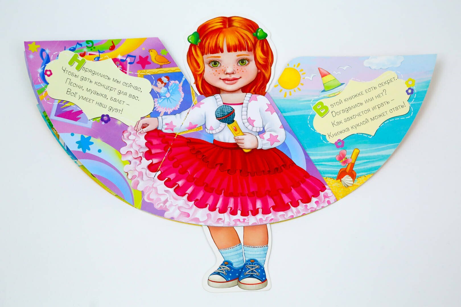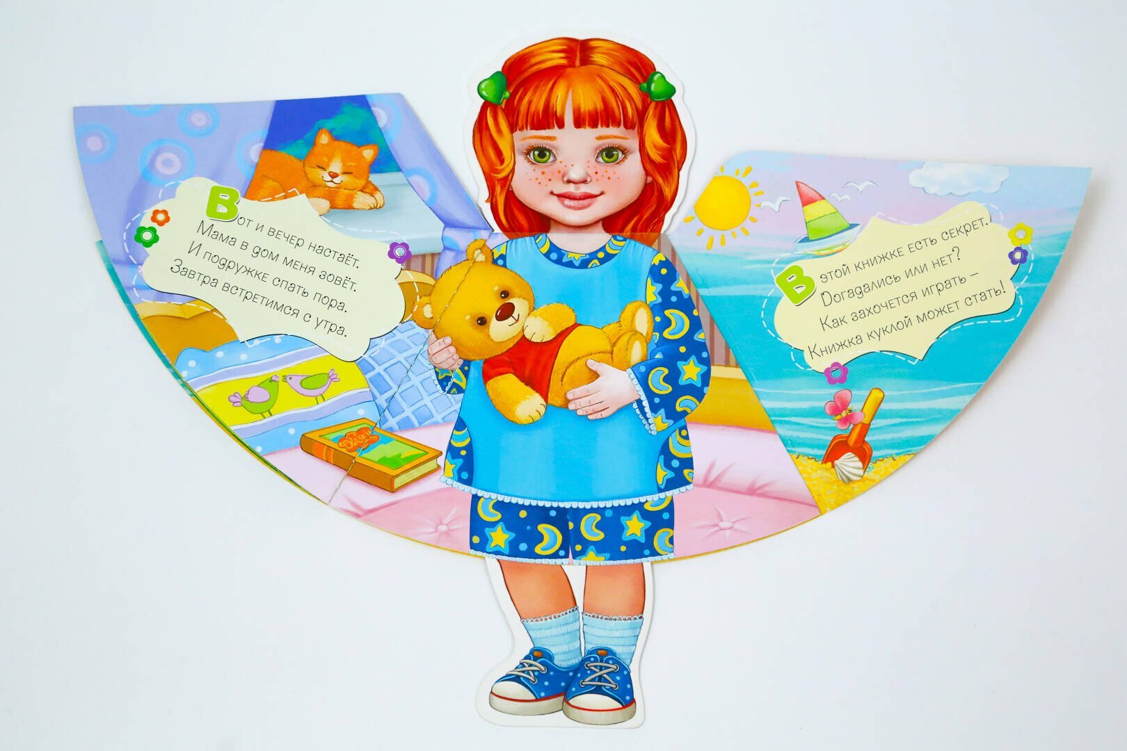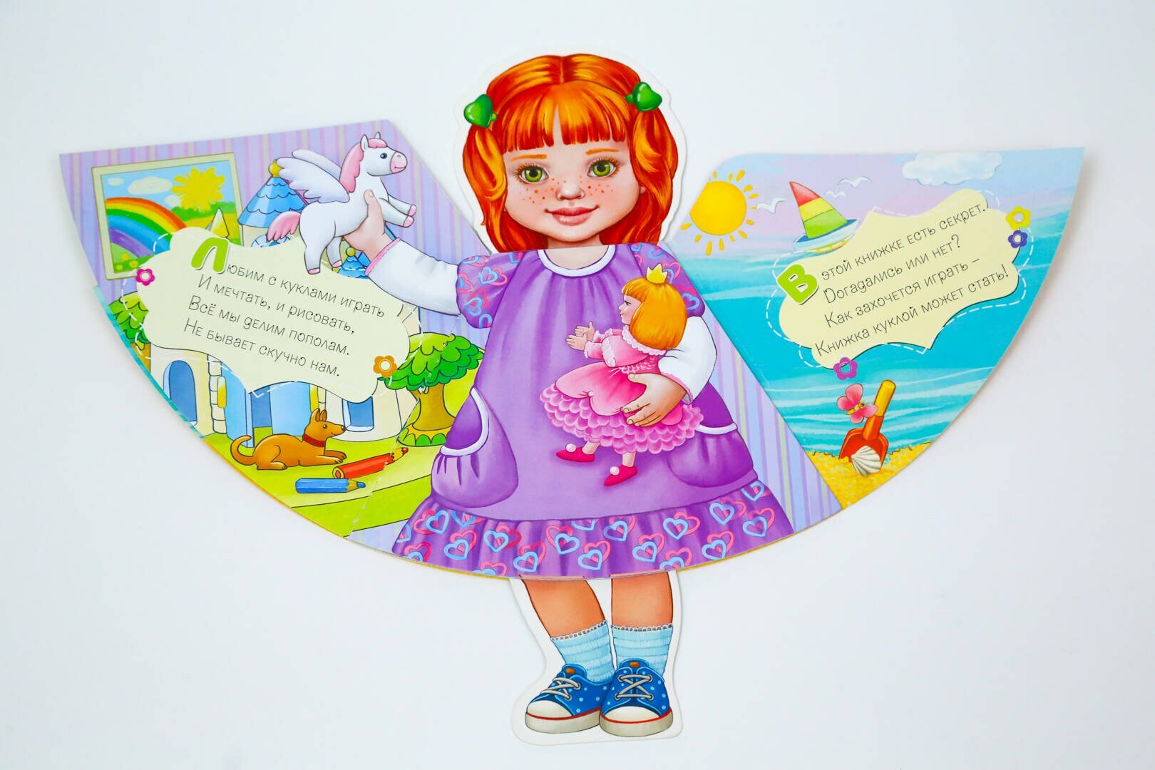 Книга-игрушка со стихами, которые можно читать ребенку перед сном, в поездке и на отдыхе. - Вырубка в форме куклы, - Красочные наряды для любимой куклы- подружки, - Плотный картон, глянцевая ламинация и серебряная фольга на обложке.