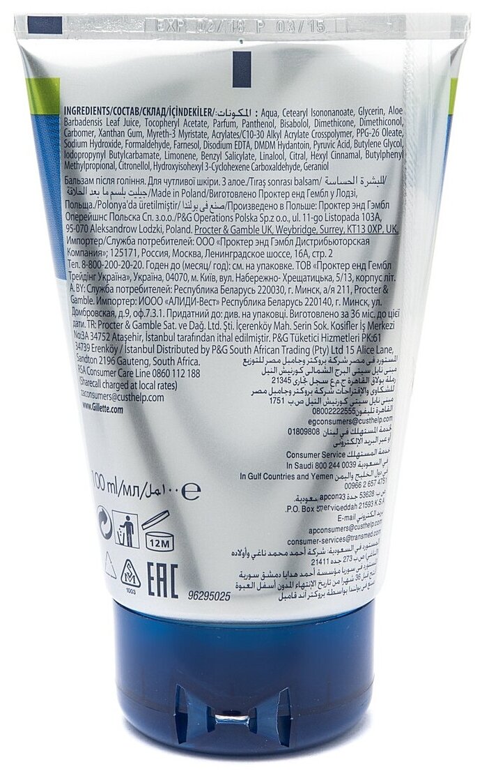 Состав товара:Aqua, Aluminium Starch Octenylsuccinate, Glycerin, Myristyl Propionate, Paraffinum Liquidum, Phenoxyethanol, Parfum, Cetyl Palmitate, PEG-30 Lanolin, Carbomer, Lecithin, Avena Sativa Kernel Flour, Methylparaben, Propylparaben, Sodium Hydroxide, Limonene, Benzyl Salicylate, Linalool, Propylene Glycol Stearate, Polysorbate 20, Sorbitan Laurate, Benzophenone-4, Citral, Triethanolamine, Hydroxyisohexyl 3-Cyclohexene Carboxaldehyde, Propylene Glycol Laurate, Alpha-Isomethyl Ionone, Citronellol, Butylphenyl Methylpropional, Coumarin, Evernia Prunastri, Eugenol.Способ применения:Заверши бритье легким нежирным бальзамом, который поможет коже выглядеть здоровой и увлажненной. Для чувствительной кожи. Бальзам после бритья.
