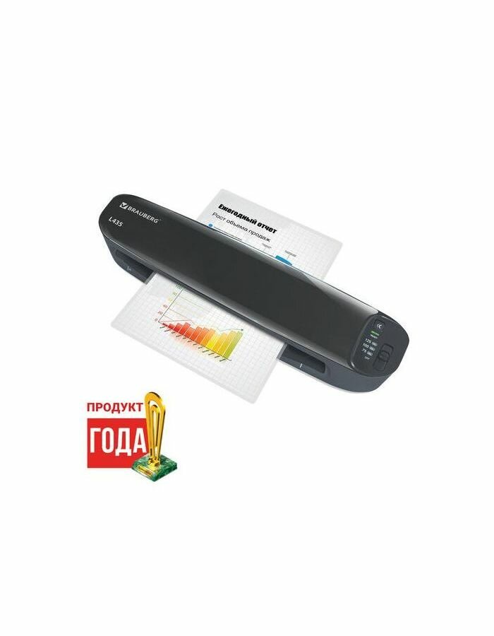 Формат: А3. Тип: пакетный. Ширина входящего документа, мм: 330. Количество валов (горячих): 2. BRAUBERG L435.Идеальный вариант для использования дома или в небольшом офисе. Предназначен для ламинирования документов, меню, рисунков, фотографий и пр.Главные особенности пакетного ламинатора Brauberg L435:ламинирует 1 лист А4 в пакетах 2х75, 2х80, 2х100 и 2х125 мкм примерно за 35 секунд; имеется функция анти-замятия; световой и звуковой сигнал готовности аппарата к работе; глянцевая поверхность корпуса. Способен заламинировать документы различных размеров от визитки до листа формата А3. Быстро ламинирует 1 документ A4 — в пределах 35 сек. Функция анти-замятия реализуется кнопкой реверса, которая позволяет комфортно извлечь замятый документ. При нажатии кнопки реверса возврат документа осуществляется в результате реверсивного движения валов аппарата, т.е. пользователю не нужно тянуть замятый лист рукой.Звуковой сигнал готовности устро