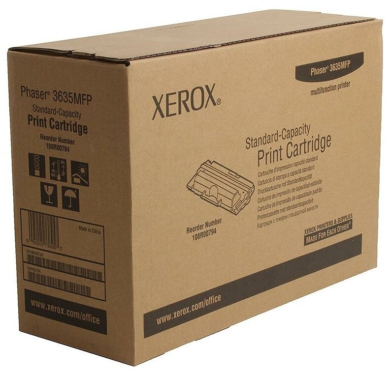 Специально для своего высокотехнологичного и удобного лазерного принтера Xerox Phaser 3635MFP, компания производит оригинальные сменные картриджи с тонером под маркировкой 108R00794. Использование оригинальных расходников снижает износ деталей, и увеличивает качество печати. Тонер в картридже черный, его хватает примерно до 5000 страниц печатного текста.