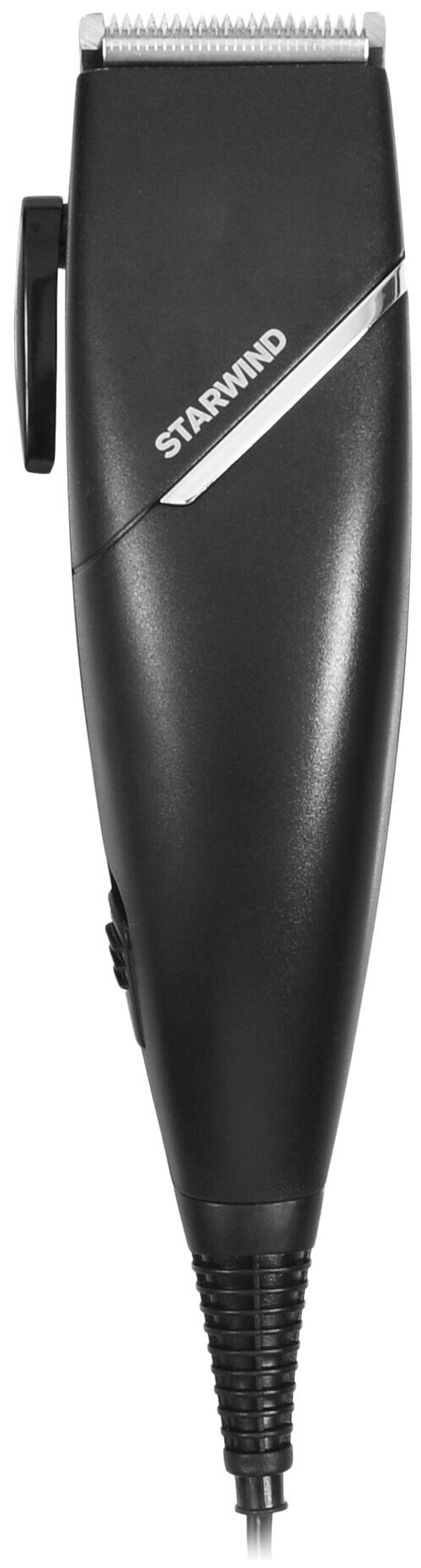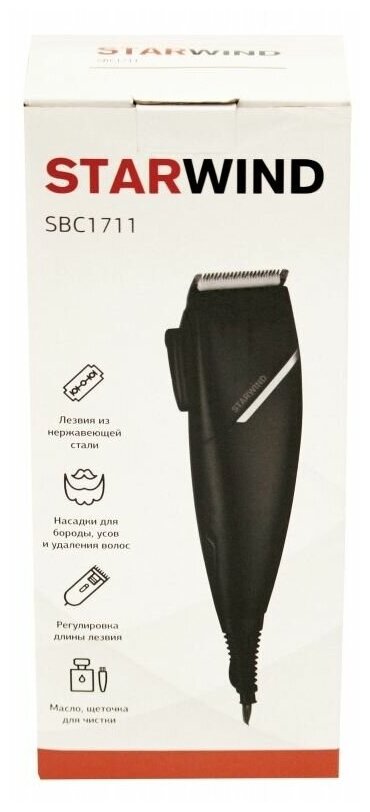 | Прочие особенности и свойства | Машинка для стрижки STARWIND SBC1711 выполнена в стильном сочетании черного и серебристого цвета. Удобная эргономичная форма устройства и его небольшая масса обеспечивают комфортные условия во время стрижки. Вы без проблем можете взять машинку с собой в путешествие. Благодаря компактным размерам она займет совсем немного места в вашей дорожной сумке и работает от аккумуляторной батареи. Лезвия этой модели изготовлены из высококачественной нержавеющей стали. Это полностью исключает появление ржавчины и развитие коррозии металла. Длину режущей части можно регулировать. Четыре направляющих гребня, входящих в комплект модели обеспечивают различную длину оставшихся после стрижки волос. Насадки имеют размер:3, 6, 9 и 12 миллиметров. Два последних гребня отлично подойдут для стрижки бороды и усов. Тщательно продуманная конструкция устройства и качественные материалы обеспечивают его надежную и безопасную службу.,,В набор входит:,- специальная щеточка, для тщательной очистки лезвий,- парикмахерская расческа, позволяющая поднимать волосы во время стрижки,- специальное масло, которым необходимо смазывать двигающиеся части,,Мощность |