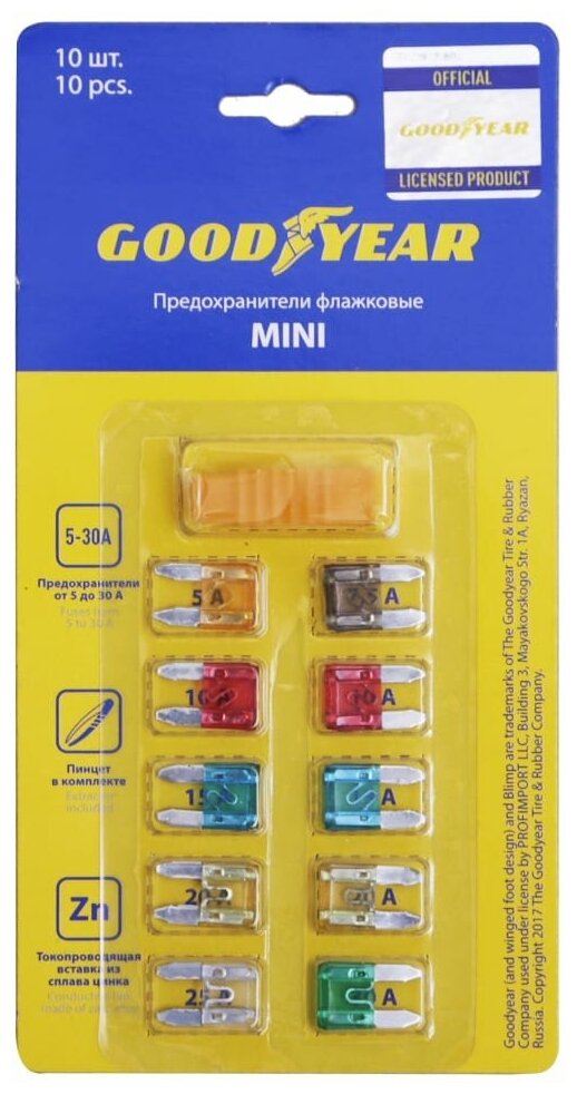Набор плавких предохранителей Goodyear флажкового типа позволяет всегда оставаться уверенным в работоспособности электрических цепей автомобиля. Состоит из 10 предохранителей, применяемых в узлах электроцепей транспортных средств и электрооборудования. Каждый предохранитель состоит из изолирующего корпуса и плавкой вставки из сплава цинка, что обеспечивает точность срабатывания в процессе использования. Предохранители обладают легкой визуальной идентификацией перегоревшего элемента. Набор в блистере укомплектован пинцетом для удобного извлечения сгоревшего предохранителя. Перфорированная разметка тыльной стороны блистера позволяет удобно извлечь из упаковки только необходимый для замены предохранитель, не открывая соседние ячейки. Все входящие в набор предохранители легко идентифицировать по цвету корпуса, соответствующего общепринятой градации по номиналу. Набор содержит предохранители номиналом 5А,7.5А, 10А, 15А, 20А, 25А, 30А типоразмера мини